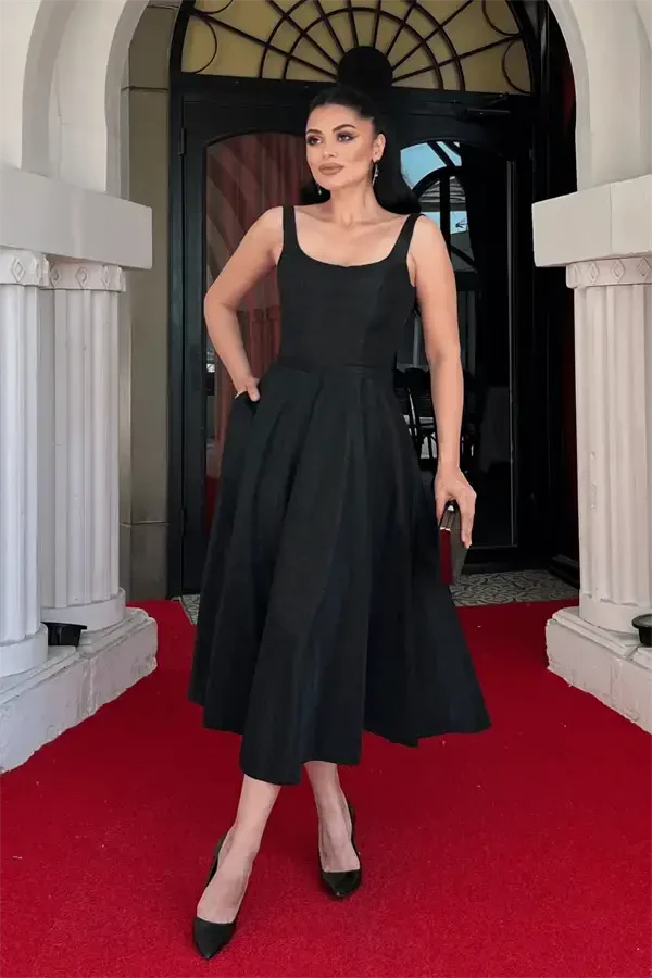 Make a statement in any setting with the chic and eye-catching Glitter Fabric Strappy Midi Dress! This dress is the perfect choice for any event, from special occasions to nights out. Combining the elegance of black with the sparkle of glitter fabric, this midi-length dress will accentuate your feminine silhouette and add a unique touch of grace. Thanks to its thin straps and figure-hugging cut, you'll achieve both a comfortable and stylish look. The midi length of the dress is designed to flatter women of all heights and won't restrict your freedom of movement.**Product Description**The Glitter Fabric Strappy Midi Dress features a special design that combines elegance and comfort. The classic elegance of black meets the sparkle of glitter fabric, creating a dazzling effect. Its thin straps and figure-hugging cut gracefully accentuate your feminine curves. The midi length makes it suitable for any occasion, while also allowing freedom of movement. It is an ideal choice for everything from special events and cocktails to romantic dinners and nightclub parties. This dress will help you express your style and attract attention wherever you go. The timeless elegance of black and the modern touch of glitter fabric will make this dress an indispensable part of your wardrobe. Thanks to its easy-to-combine structure, you can create different styles with different accessories and shoes. For example, you can achieve evening elegance with heels and a stylish clutch, or a more relaxed and bohemian vibe with sandals and a straw hat. The fabric of the dress provides a soft touch to your skin, while its durability ensures you can use it for many years. The glitter details ensure that the dress retains its sparkle for a long time without losing its original appearance. This dress will not only enhance your appearance but also boost your self-confidence. It will allow you to feel special while showcasing your elegance and style at every step. Enjoy every moment and create unforgettable memories with the Glitter Fabric Strappy Midi Dress. Remember, style is not just about what you wear, but also about the confidence you carry. This dress will help you take your style to the next level by offering you both. Be prepared to showcase the best version of yourself at all times with this dress, which is a candidate to be the pearl of your wardrobe. Dazzle with your sparkle and leave an unforgettable mark in every setting!**Product Features*** Glitter fabric* Thin straps* Midi length* Figure-hugging cut* Black color**Additional Information**Dry cleaning is recommended. Different size options are available. The model is wearing size S.