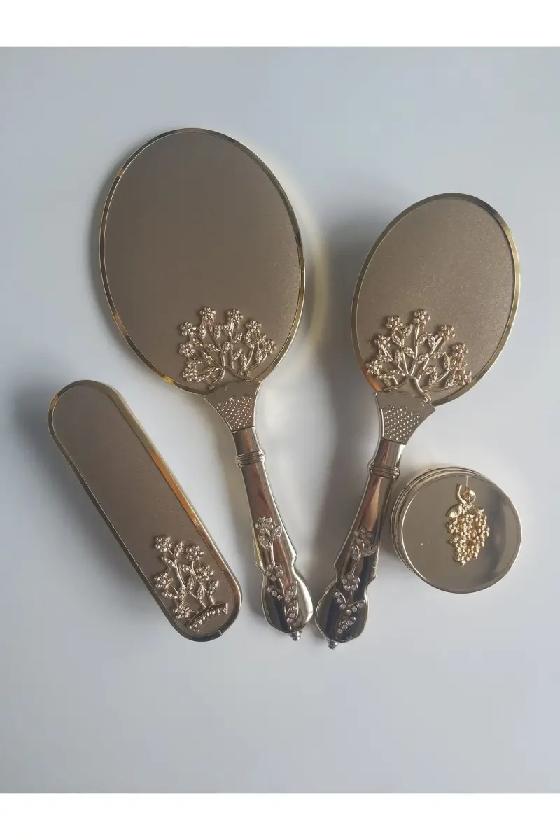 Побалуйте себя нашей золотистой свадебной шкатулкой для приданного с зеркалом и расческой, которая станет самым ярким предметом приданого невесты в самый особенный день. Этот специальный дизайнерский набор, который незаменим в сундуках с приданым, объединяет в себе элегантность и стиль и будет сопровождать ваши незабываемые воспоминания. Кроме того, вы можете приобрести его по самым доступным ценам, без ущерба для качества, с гарантией ÇEYİZİM KAPINDA. Этот набор, каждая деталь которого тщательно продумана, является кандидатом на то, чтобы стать самой ценной частью свадебной шкатулки. Этот специальный дизайн, изготовленный вручную и украшенный импортными брошами из нержавеющей стали, сохранит свой первоначальный блеск на долгие годы. Ручное зеркало, ручная расческа, шкатулка для украшений (или пудреница) и кисть, входящие в набор, предназначены для удовлетворения всех потребностей невесты. Этот набор, также известный в народе как туалетный набор, — это не просто предмет, а память и ценность. Этот набор, тщательно упакованный в специальную картонную коробку с атласной подкладкой, не только обеспечивает стильную презентацию, но и гарантирует безопасную доставку товаров вам. Добавьте ценности подготовке приданого, одному из самых приятных этапов подготовки к свадьбе, с помощью этого уникального набора. Этот набор, отражающий благородство и элегантность золотого цвета, идеально подойдет к вашему свадебному платью и заставит вас почувствовать себя особенной. Спешите, не упустите эту возможность, которая ограничена запасами! Помните, самые прекрасные воспоминания спрятаны в самых особенных деталях. Сделайте свой свадебный день и подготовку к приданому незабываемыми с помощью этого специального набора.