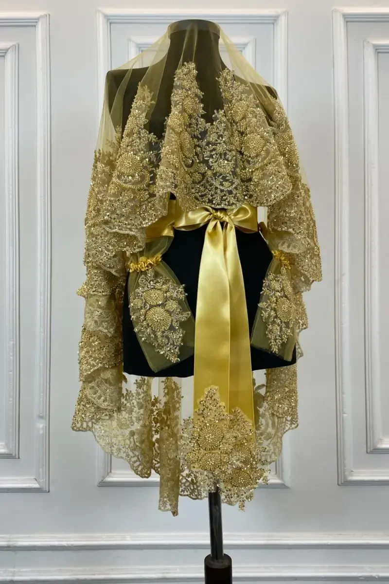 Gold Vıp Deluxe Bridal Veil Set, Henna Veil 6 Piece Full Set-Gold is a wonderful option to complement your elegance and style on your special days. This set consists of 6 eye-catching pieces, carefully designed for brides-to-be and those preparing for henna night, with every detail. This set, which will allow you to leave an unforgettable mark on your special moments such as weddings and henna nights, carries the nobility and splendor of gold color.Product DescriptionGold Vıp Deluxe Bridal Veil Set is a complete 6-piece set that will make you shine like a star on your most special days and help you create unforgettable memories. This set is not just a veil, but also an accessory that will enrich the atmosphere of your henna night and wedding ceremony and add confidence and elegance to you. This set, designed with the magic of gold color, combines traditional and modern lines and adapts to every style. Each piece in the set is made of high quality materials and will maintain its elegance for many years. Bridal veils, henna veils and other accessories attract attention with their meticulously crafted details and elegant designs. This set is not just an accessory, but also a memory, a keepsake and a valuable legacy to be passed on to the future. This set, which will be one of the most important parts of your wedding preparations, will perfectly match your wedding dress and transform you into the bride of your dreams. On your henna night, this set, which you can use with your traditional clothes, will give you a completely different atmosphere and ensure that all eyes are on you throughout the night. Gold Vıp Deluxe Bridal Veil Set is not just a veil set, but also a style statement. With this set, you will feel special and valuable, and you will have a perfect look on your happiest days. Designed with the elegance and splendor of gold color, this set will give you unforgettable moments and will be a memory that you will always remember. This set is also one of the most meaningful and valuable gifts you can give to your loved ones. By gifting this set to a bride-to-be or a friend preparing for a henna night, you can show that you are with them on their happiest days. Gold Vıp Deluxe Bridal Veil Set is not just a product, but also an emotion. Make your loved ones happy with this set and make your most special moments unforgettable.Product Features* Full set of 6 pieces* Gold color* High quality materials* Design suitable for bridal and henna concept* Elegant and stylish detailsAdditional InformationOur product is sent in a specially designed box. Dry cleaning is recommended. Requires delicate use.