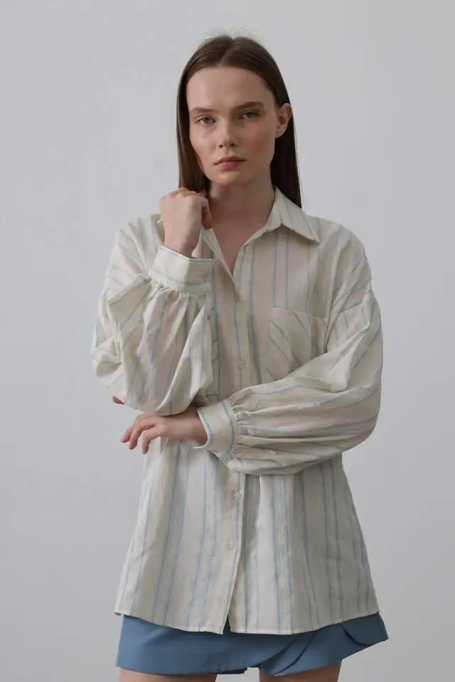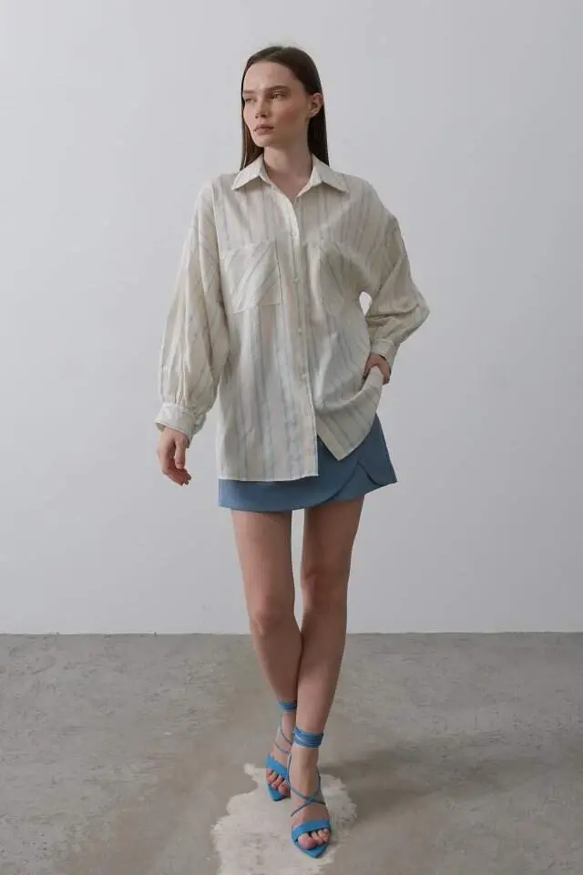 Gömlek - Bej MaviModelin Ölçüleri: Boy: 165, Kg: 55, Göğüs: 90, Bel: 72, Kalça: 100Modelin üzerindeki ürün M/38 bedendir