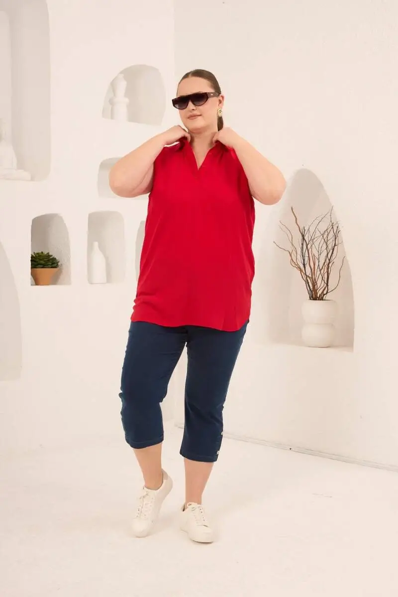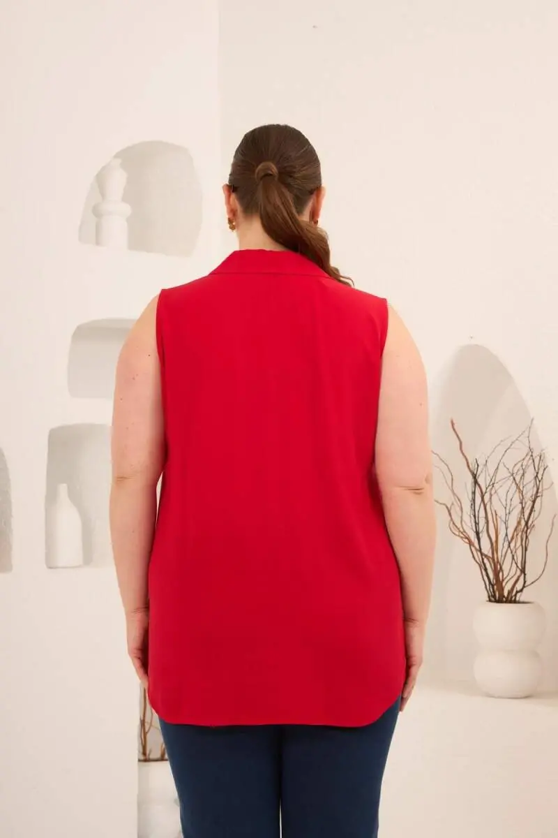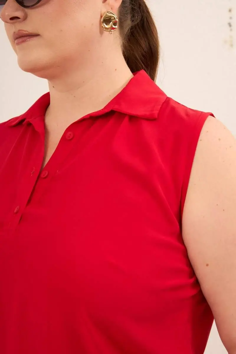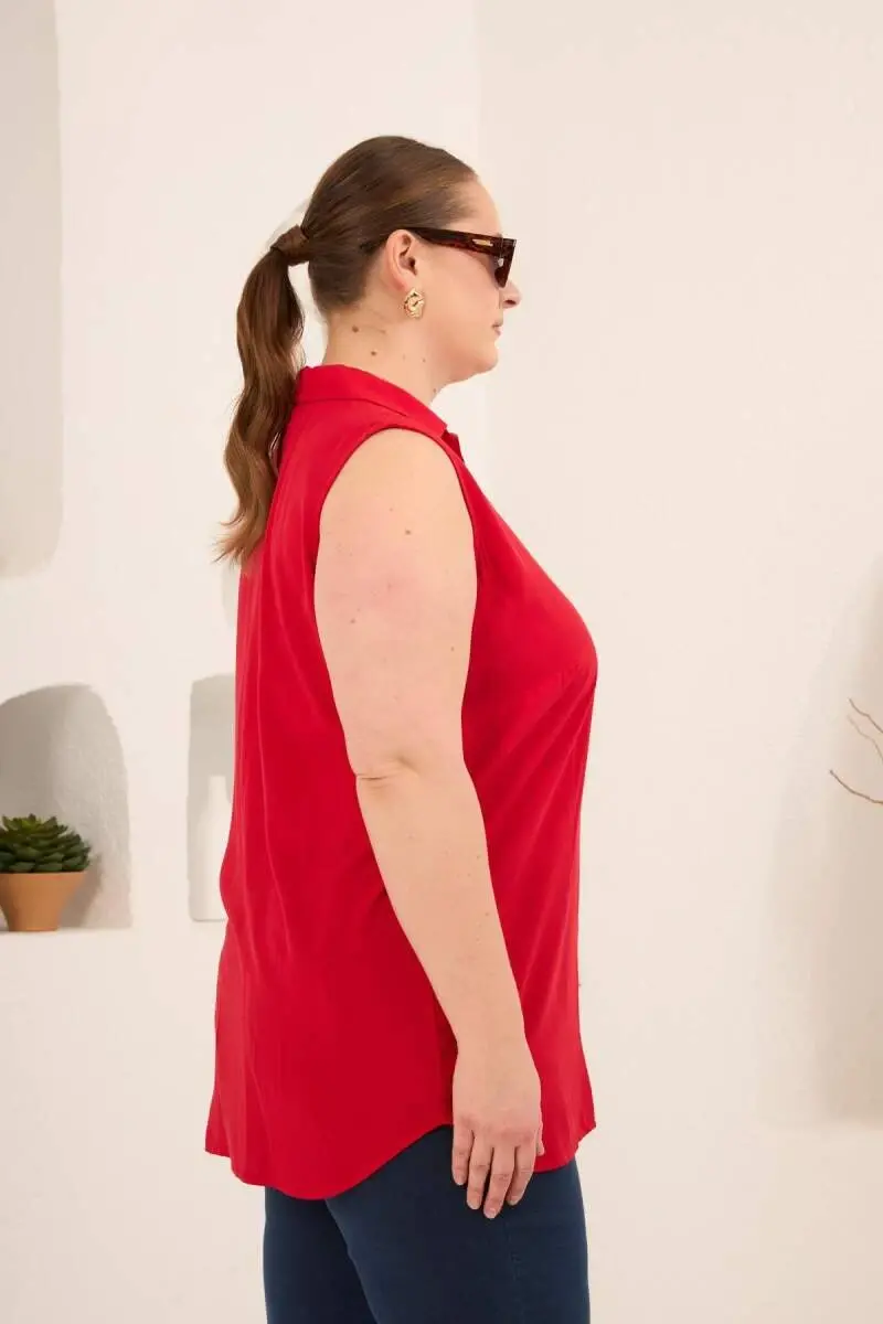 Gömlek Yaka Kolsuz Büyük Beden Viskon Bluz Kırmızı