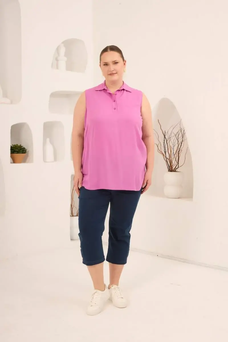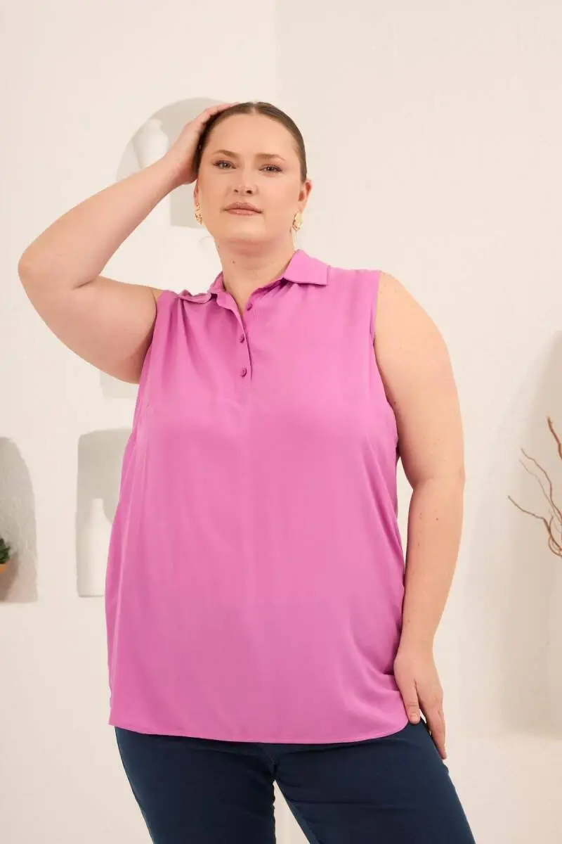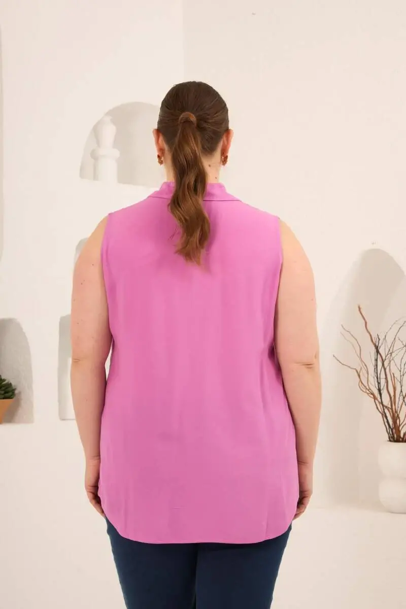 Gömlek Yaka Kolsuz Büyük Beden Viskon Bluz Lila