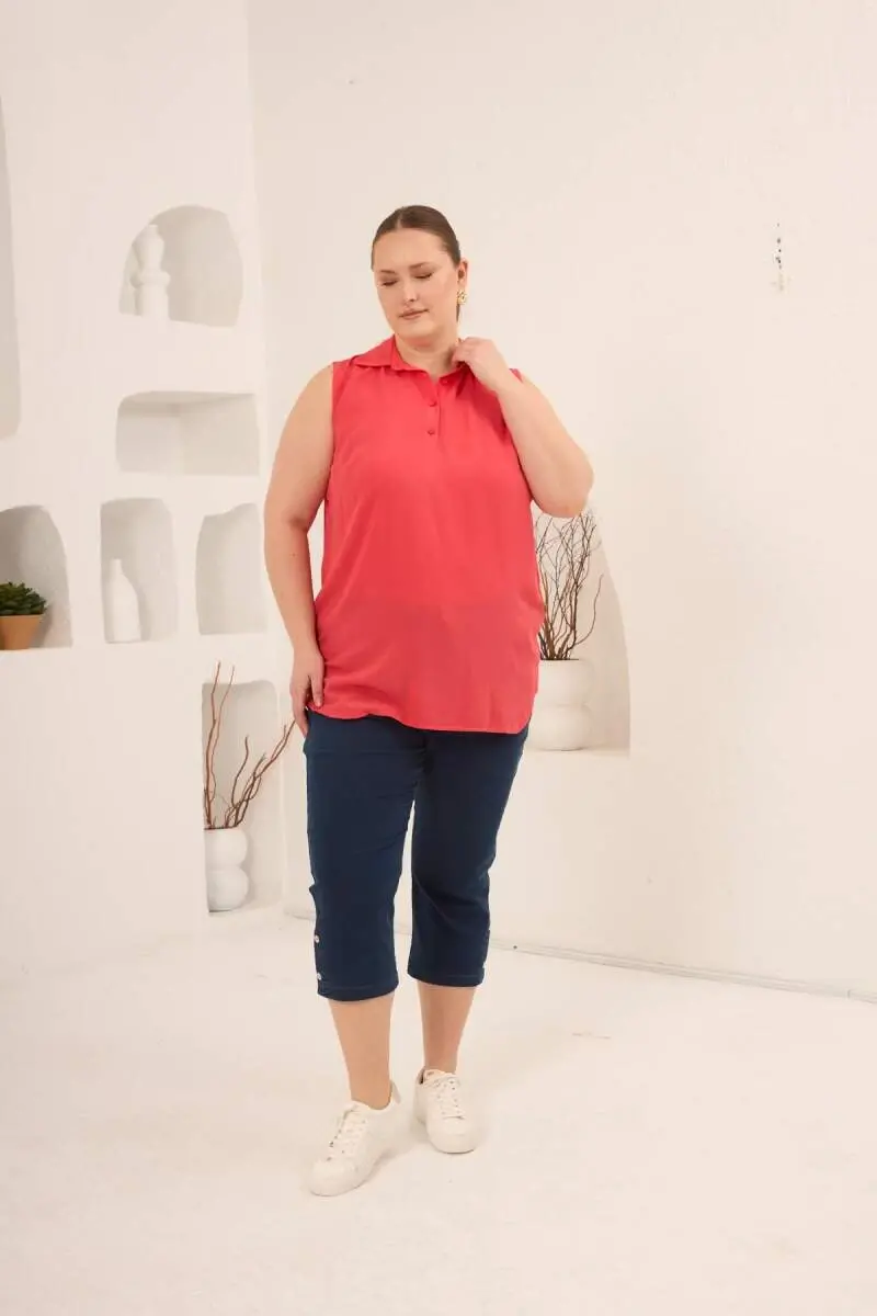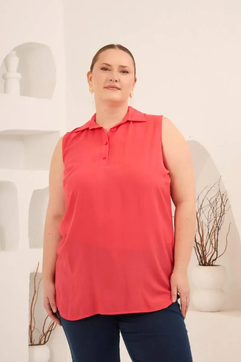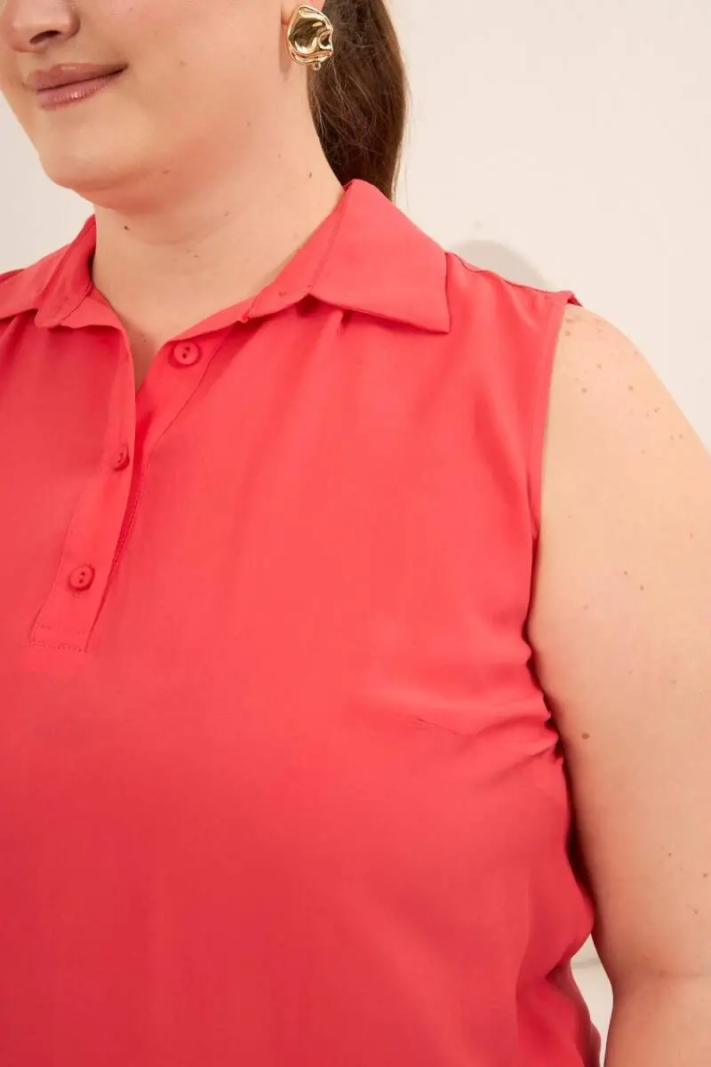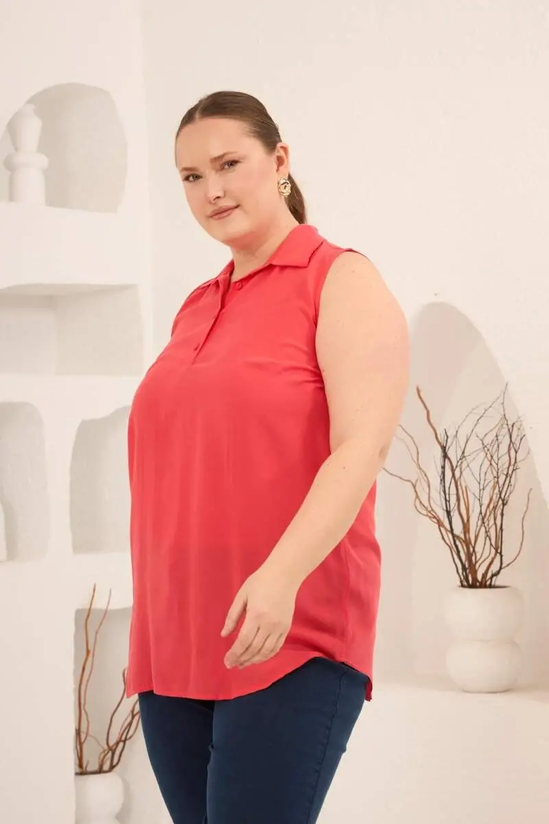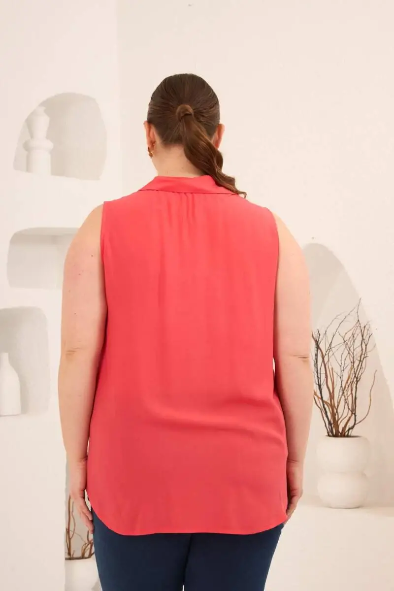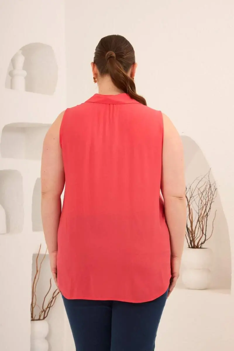 Gömlek Yaka Kolsuz Büyük Beden Viskon Bluz Mercan