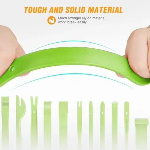 Grade Nylon: Made of high-quality nylon POM material, sturdy and durable, not like some brittle material which bents or cracks easily Multifunctional tools: These 13 PCS different kinds of trim tools used for car audio/radio system installing or removing, door panel, moldings, emblems, window trims or automotive interior repairing and furniture restoration Easy Access and Storage: Comes with a portable tool bag to help you be more productive and less prone to losing tools Protect Your Car: As a car lover, such a tool set with matte finish will not be vulnerable to damaging the car, which will perfectly meet your need and prolong the use time of your car Package Include: Including 11 PCS Interior trim disassemble tools and 2 PCS Car terminal removal tools, altogether 13 PCS trim removal tool set