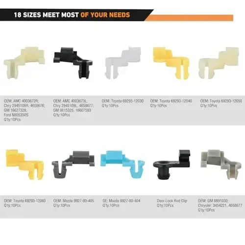 GOOACC 165-piece door lock rod clip set is an ideal solution for securing door lock mechanisms, tailgates, and door handles in your vehicles. This comprehensive set includes 18 different sizes of clips designed to fit various vehicle makes and models. Meeting or exceeding original equipment manufacturer (OEM) standards, these clips offer a reliable alternative to worn or broken parts. The various clips included in the set are suitable for many models of Chevrolet Silverado, GMC Sierra, GM Trucks, Ford, Chrysler, Toyota, and Mazda vehicles. This set not only offers wide compatibility but is also made from high-quality materials. The heavy-duty nylon construction ensures long-lasting and durable performance. The robust structure of the clips provides resistance against vibration and harsh weather conditions, guaranteeing the safe and smooth operation of your door locking systems. GOOACC door lock rod clips save you time with their ease of installation and eliminate the need for professional service. Choose the GOOACC 165-piece door lock rod clip set to restore the safety and functionality of your vehicle's door locking systems. This set is not just a spare part but also a long-term investment for your vehicle maintenance. GOOACC offers a wide range of retainers, clips, fasteners, and hardware with over 10,000 fasteners. This ensures that you can find the right part for your needs. Repair your vehicle's door locking systems with confidence and experience GOOACC quality.