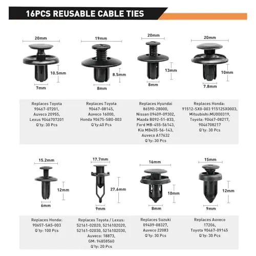 This set is ideal for securing various panels and parts in your vehicles. Thanks to the different sizes of clips included in the set, you can find suitable fasteners that you can use in different areas of your vehicle. It is a perfect solution for those who like to maintain their own vehicle and is more economical than going to auto spare parts stores.