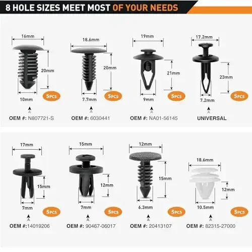 GOOACC 88 qismli trimni olib tashlash to'plami yordamida avtomobilingizning ichki va tashqi qismlarini xavfsiz tarzda olib tashlashingiz va o'rnatishingiz mumkin. Ushbu keng qamrovli to'plam avtomobilsozlikdan tortib dengiz, mebel va aviatsiyagacha bo'lgan keng ko'lamli foydalanish uchun mo'ljallangan. To'plamga kiritilgan 12 xil o'lchamdagi kliplar GM, Chrysler, Ford, Toyota, Nissan, Mazda, Hyundai, Kia, AMC, Jeep kabi ko'plab avtomobil markalariga mos keladi. Shunday qilib, avtomobilingizning markasi va modeli qanday bo'lishidan qat'i nazar, sizga kerakli klipni osongina topishingiz mumkin. Trimni olib tashlash vositalari panellarni, kalıplarni, deraza tokchalarini, kliplarni, mahkamlagichlarni, emblemalarni va radiolarni shikastlamasdan olib tashlashga yordam beradi. Yuqori sifatli, zarbga chidamli neylon tolali materialdan tayyorlangan ushbu asboblar toksik moddalarni o'z ichiga olmaydi va uzoq umrga ega. Zanglamaydigan po'latdan yasalgan stereo olib tashlash vositalari va avtomatik terminalni olib tashlash vositalari nozikroq operatsiyalarda yordam beradi, folga qirg'ich va qoplamani olib tashlash vositalari esa turli ehtiyojlaringizni qondiradi. To'plamga kiritilgan yopishtiruvchi kabel kliplari kabellaringizni tartibli ravishda mahkamlash imkonini beradi. Ko'chma saqlash sumkasi butun to'plamni tartibli saqlash va tashishni osonlashtiradi, shuning uchun siz vaqtingiz va joyingizni tejaysiz. GOOACC 88 qismli trimni olib tashlash to'plami professional va havaskor foydalanuvchilar uchun ideal echimdir. Avtomobilingizning ichki va tashqi qismlarini olib tashlash va o'rnatishni osonlashtiradi, shuningdek, narsalaringizga zarar etkazish xavfini minimallashtiradi.
