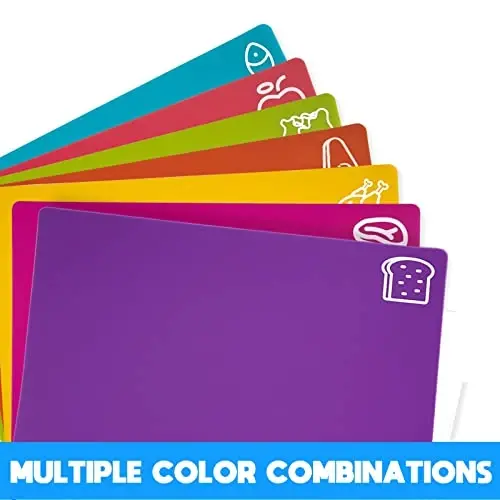 Large Enough Size - The flexible cutting mats for cooking dimensions are 14.65*11.02 inches, which makes enough space for food. The lightweight design is great for college apartments, small kitchens, RVs, or camping. Multicolor Set - The cutting board set is designed with rainbow colors, each color represents one kind of food. It could avoid food stringing due to mixing chopping board when cutting food. Non-slip Design - The kitchen cutting boards have a lattice pattern on the back, which adds nicely to the stability of the board. The cutting board will stay in place while cutting cheese. The surface has a slight texture. It stabilizes the knife while cutting and doesn't dull the blade. Flexibility - Cutting mats for kitchen flexible enough to bend at an angle to deliver chopped food to cooking pots, pans, and frying pans easily. Easy to Clean - The cutting boards for kitchen dishwasher safe are made of food-grade material and are BPA-free. After use, it can be washed in the dishwasher for future use. Note: Ensure the dishwasher temperature is kept below 194°F (90°C).