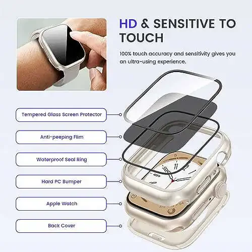 The Goton 2-in-1 Waterproof Privacy Case protects your Apple Watch from scratches and prying eyes. The front tempered glass screen protector protects your device's screen from impacts and scratches, while also adding a privacy filter to the front, ensuring that your screen is only visible to you. The back bumper protects your Apple Watch's case from bumps and drops.