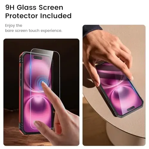 Package contents: iPhone 16 case and tempered glass screen protector. Customer support is available for quality issues.