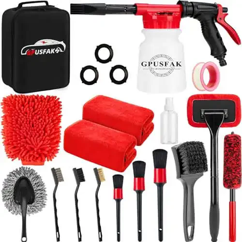 car wash kit, car cleaning kit, car cleaning, car care, GPUSFAK, foam gun, detailing brush, windshield cleaner, rim and tire brush, car towels