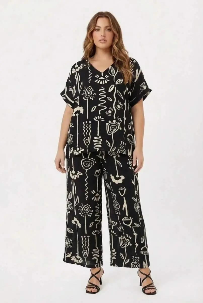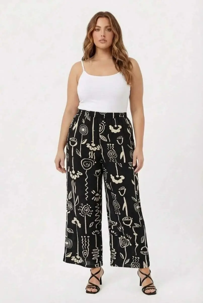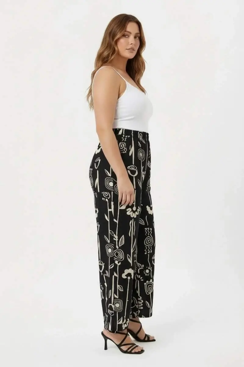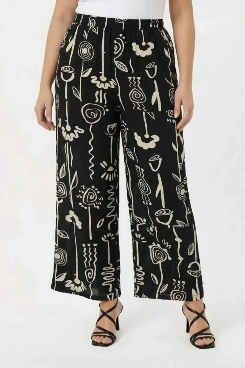 Grafik Desenli Kadın Büyük Beden Pantolon Siyah