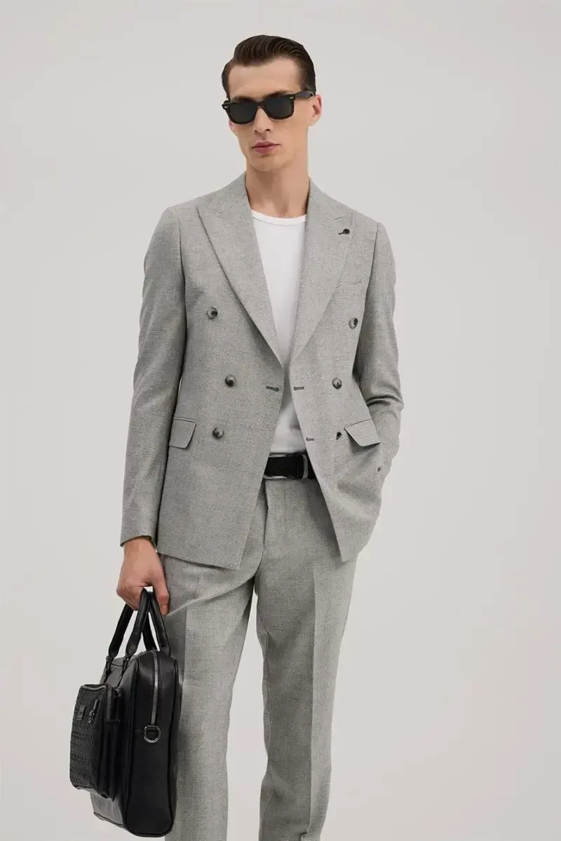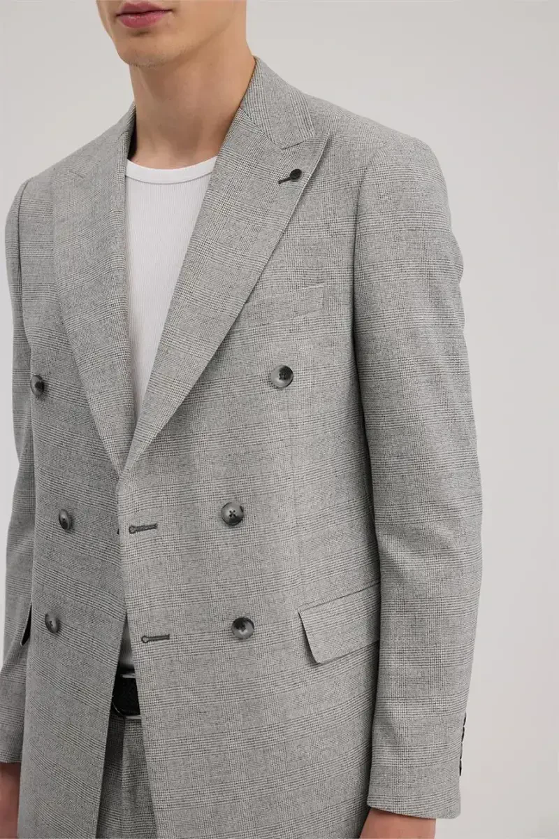 Suit, slim fit, plaid, double-breasted, gray, men's, modern, stylish, comfortable, style