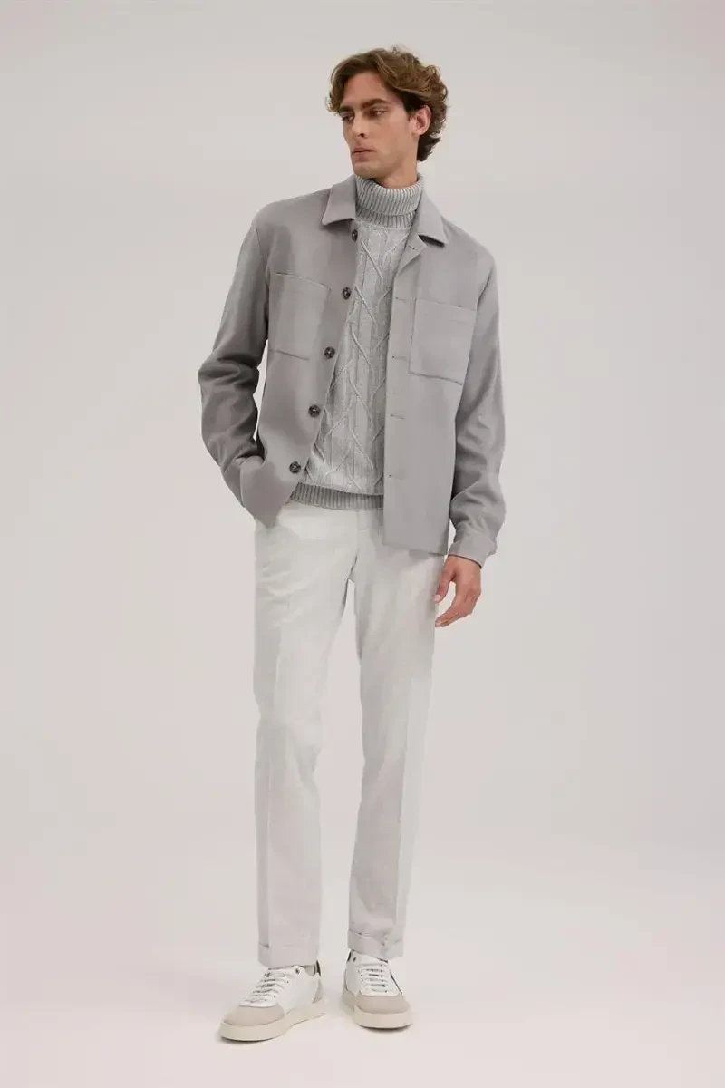 Take your style to the next level with the Gray Slim Fit Shirt Collar Jacket. This modern and stylish jacket is a perfect choice for both everyday use and special occasions. Thanks to its slim fit cut, this jacket, which fits your body and creates an elegant silhouette, adds a different touch with its shirt collar detail. The high-quality fabric blend ensures that the jacket is both durable and comfortable. The 75% polyester content guarantees that the jacket is long-lasting and does not wrinkle easily, while the 21% viscose content provides a soft touch and a nice drape. The 4% elastane content increases the flexibility of the jacket, offering freedom of movement. Its gray color will be an indispensable part of your wardrobe, compatible with all kinds of combinations. Whether you want to achieve a sporty look with jeans or create a more stylish style with classic trousers, this jacket will always complement your style. The shirt collar detail makes the jacket stand out from the others and offers a remarkable look. The button-down front allows the jacket to be easily put on and taken off. Pockets are ideal for carrying your belongings safely. Thanks to its inner lining, it keeps you warm in cold weather. The Gray Slim Fit Shirt Collar Jacket is one of the must-haves in your wardrobe, offering both elegance and functionality. The size 50 on the mannequin shows the jacket's fitted cut and stylish stance. The mannequin's height of 187 cm, weight of 78 kg, shoulder width of 120 cm and chest size of 100 cm will give you an idea of how the jacket fits different body types. By choosing this jacket, you can both reflect your style and have a comfortable wearing experience. You can easily prefer this jacket in your daily activities, business trips or special invitations, and it will allow you to show off your elegance in any environment. The Gray Slim Fit Shirt Collar Jacket is not just a jacket, but also a style statement. Choose this jacket to feel special and reflect your style.