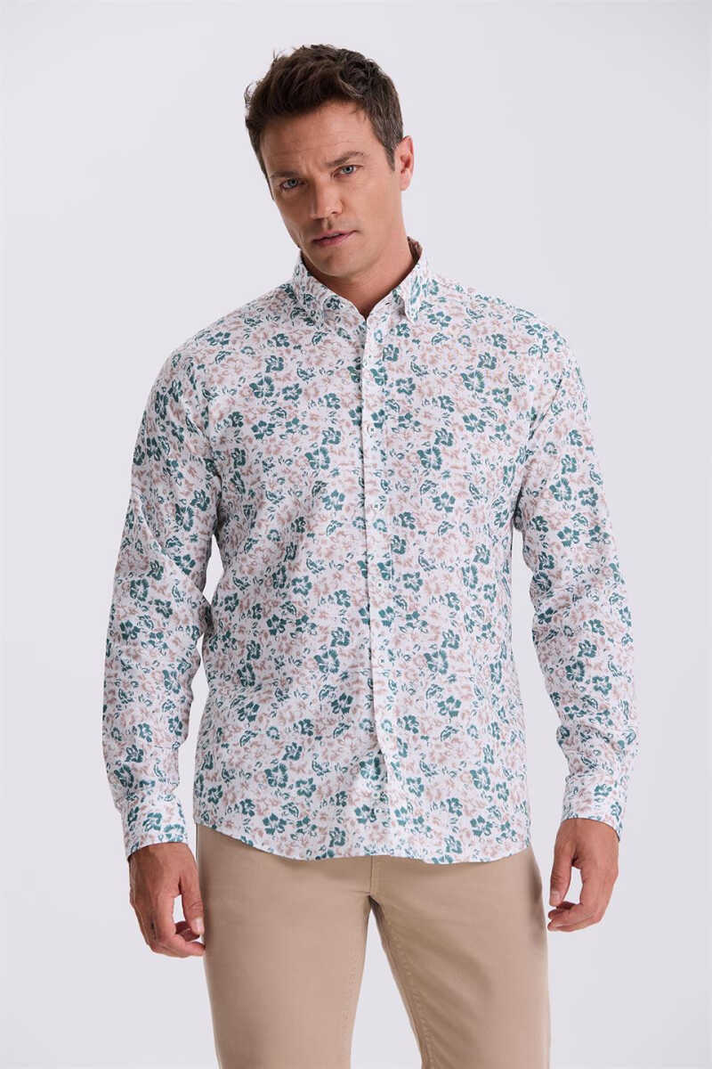 **Green Floral Print Comfort Fit Shirt**Crafted from 100% pure cotton, this comfort fit shirt will feel luxuriously soft against your skin. Its elegant and sophisticated design makes it a versatile choice for both casual and formal occasions.**Features:*** **Pattern:** Vibrant green floral print* **Collar:** Button-down classic collar* **Sleeves:** Long sleeves* **Fit:** Relaxed fit that doesn't cling to your body* **Model Measurements:** * Height: 189 cm * Chest: 100 cm * Waist: 98 cm* **Model Size:** LThis shirt pairs perfectly with jeans, chinos, or skirts. Its easy-to-iron fabric ensures you'll always look polished.If you're looking for a stylish and comfortable shirt, the Green Floral Print Comfort Fit Shirt is the perfect choice for you. Order yours today and elevate your wardrobe with this exceptional piece!