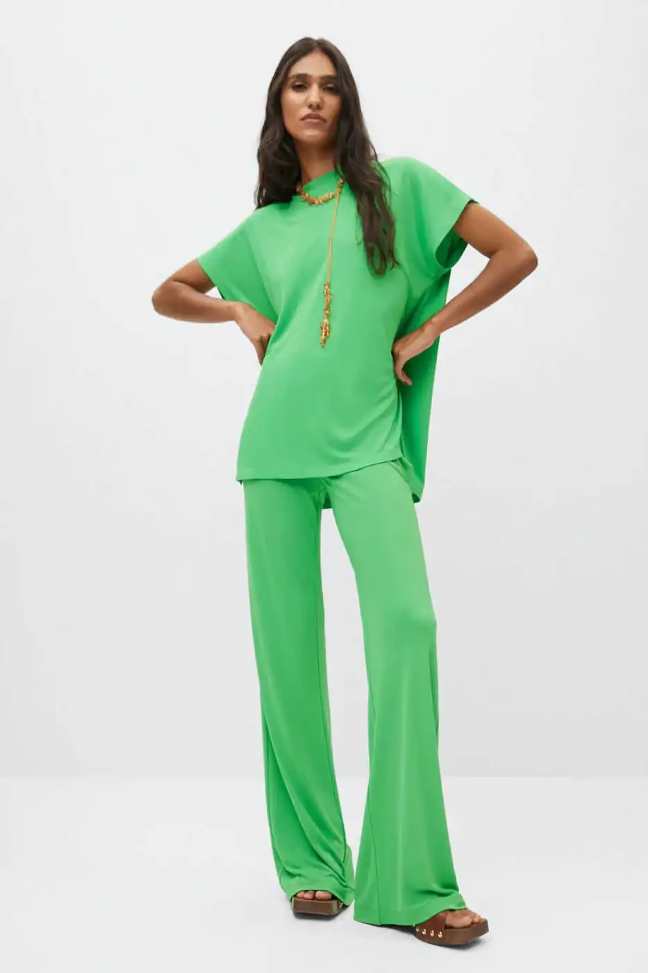 Green women's pants, regular waist, woven fabric, regular length, flare cut, eco-friendly