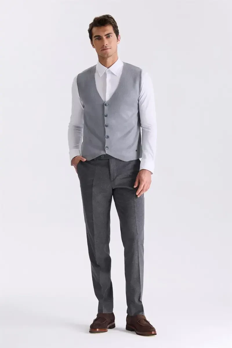 **Grey Slim Fit Buttoned Knitted Vest**Crafted from a blend of 90% acrylic and 10% wool, this knitted vest offers a soft and warm texture. Designed with a chic and contemporary style, it effortlessly complements any outfit.Features:* Slim fit silhouette* Single-button closure* Ribbed neckline and armholes* Modeled in a size 50 by a mannequin with a height of 187 cm, weight of 78 kg, shoulder width of 120 cm, and chest circumference of 100 cm.**Composition:*** 90% Acrylic* 10% Wool**Care Instructions:*** Machine wash at 30 degrees Celsius.* Do not bleach.* Do not tumble dry.* Do not iron.