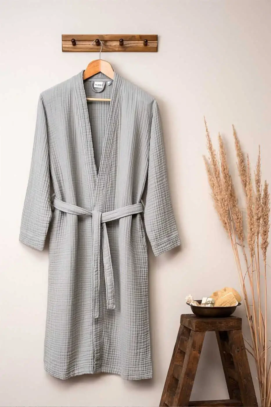 Indulge in luxury and comfort! Elevate your bath time experience with the Gray Unisex Kimono Muslin Bathrobe. Made from 100% cotton yarn, this superior quality bathrobe will enchant you with its soft texture and unparalleled absorbency. Thanks to its 4-layer muslin weaving technique, the bathrobe has a breathable and extremely soft structure, allowing you to dry without irritating your skin. With its stylish kimono design, this bathrobe suits every style and is ideal for everyday use. Its high moisture absorption property speeds up the drying process after bathing and keeps you feeling dry and comfortable. Made from superior quality cotton yarn, the Gray Unisex Kimono Muslin Bathrobe will retain its softness and durability for many years, making it the perfect choice for those seeking both comfort and style. Offered to you with the guarantee of Denizli Concept, this bathrobe also offers a 15-day free return option. Add it to your cart now and enjoy the comfort and style in your daily life! The gray color of the product will make your experience after each bath more enjoyable. The unisex design makes it suitable for both women and men. With S/M and L/XL size options, you can find a suitable size for everyone. You are at the right address in your search for high quality, comfort and style.