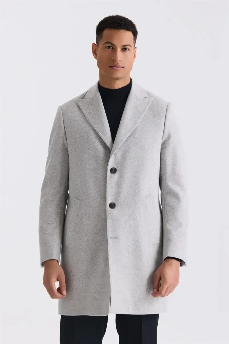 Gri Sivri Yaka Balık Sırtı Yünlü Kaşe Kaban | Soğuk Havalar İçin Şıklık
