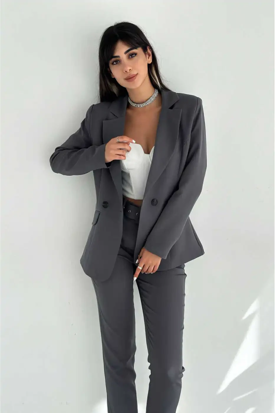 Zarif ve şık bir görünüme kavuşmak için ideal olan Gri Kruvaze Blazer Ceket Havuç Pantolon Takım Elbise, gardırobunuzun vazgeçilmez parçalarından biri olacak. Kruvaze kesimli blazer ceketi, zarif bir görünüm sunarken, havuç kesim pantolon ise modern ve konforlu bir tarz yaratır.