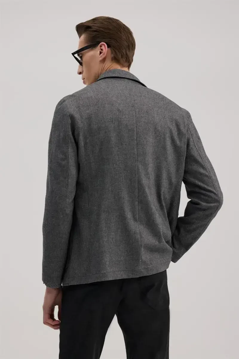 The Grey Slim Fit Mandarin Collar Flap Jacket, which combines elegance and comfort, is a candidate to be an indispensable part of the modern man's wardrobe. With its perfect cut and carefully selected fabric content, this jacket will take your style to the next level for both special occasions and everyday use. The mandarin collar detail adds a sophisticated touch to the jacket, while the flap design offers a modern and dynamic look. Thanks to its slim fit cut, this jacket that fits the body helps you create a stylish and elegant silhouette.This special design jacket is made of a blend of 50% polyester, 25% viscose, 18% wool, 5% PA and 2% elastane. Polyester increases the durability of the jacket, while viscose gives the fabric softness and draping. The wool content keeps the jacket warm, offering comfortable use even in cold weather. PA (Polyamide) and elastane increase the flexibility of the jacket, providing freedom of movement. This way, you will feel comfortable and stylish all day long.The gray color allows the jacket to be used in many ways. It can be easily combined with clothes in different colors and styles. You can create a stylish combination with a classic shirt and fabric trousers, or a casual style with a casual T-shirt and jeans. The lining inside the jacket increases comfort, while the high-quality fabric on the outer surface offers long-lasting use.The size on the model is size 50. The model's measurements are as follows: Height: 187 cm, Weight: 78 kg, Shoulder: 120 cm, Chest: 100 cm, Waist: 80 cm, Hips: 100 cm. These measurements will give you an idea of how the jacket will look on you. When choosing a size, you can choose the most suitable size by taking your own measurements into consideration.The Grey Slim Fit Mandarin Collar Flap Jacket not only offers a stylish look, but is also a comfortable and useful option. It helps you reflect your style in any environment, from business meetings to special invitations, from daily use to travel. This jacket, which will be one of the most valuable pieces of your wardrobe, will accompany you for many years. Thanks to its high-quality material structure and careful workmanship, it offers long-lasting use. It is an ideal choice for men who want to combine elegance and comfort.
