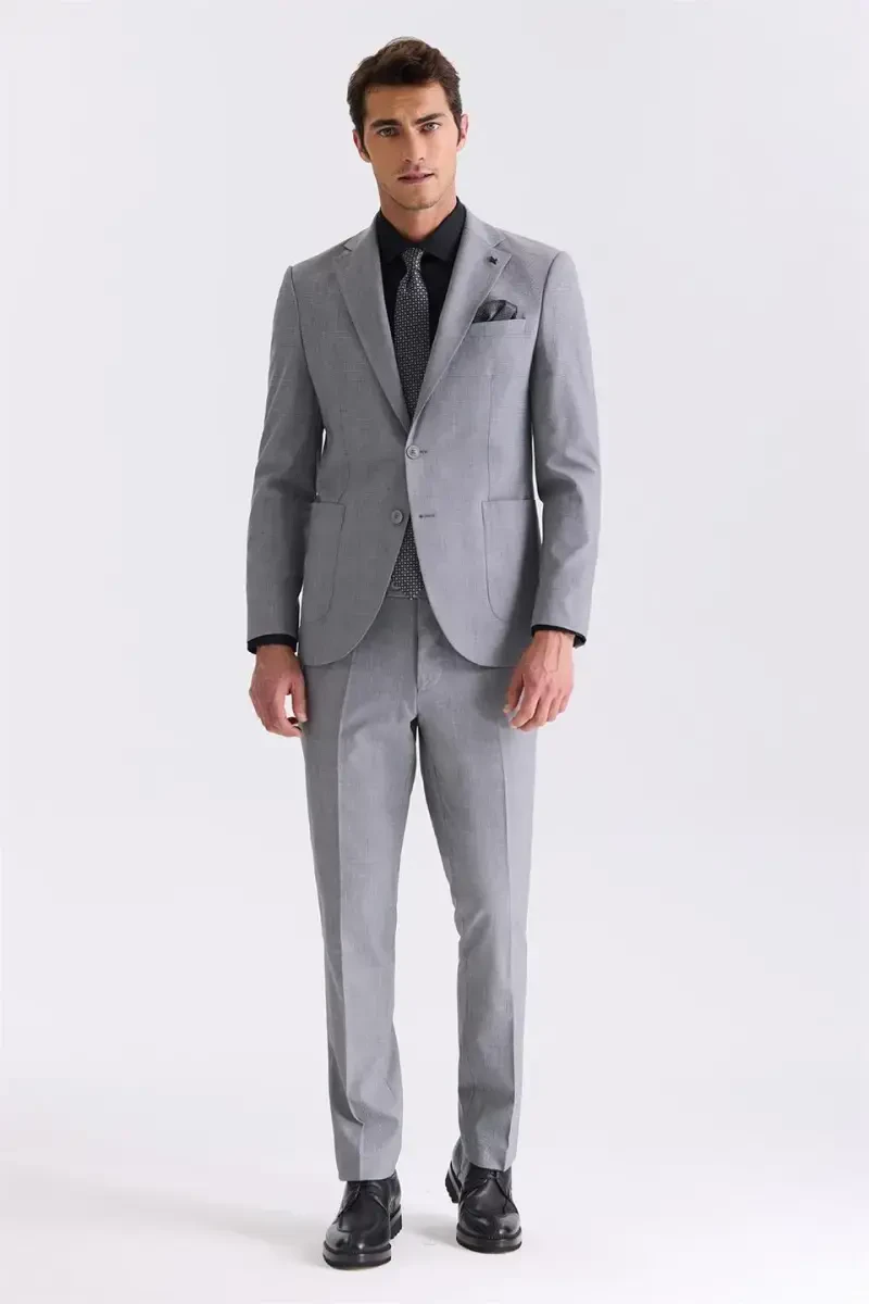 gri takım elbise, slim fit takım elbise, mono yaka takım elbise, yünlü takım elbise, şık takım elbise, modern takım elbise