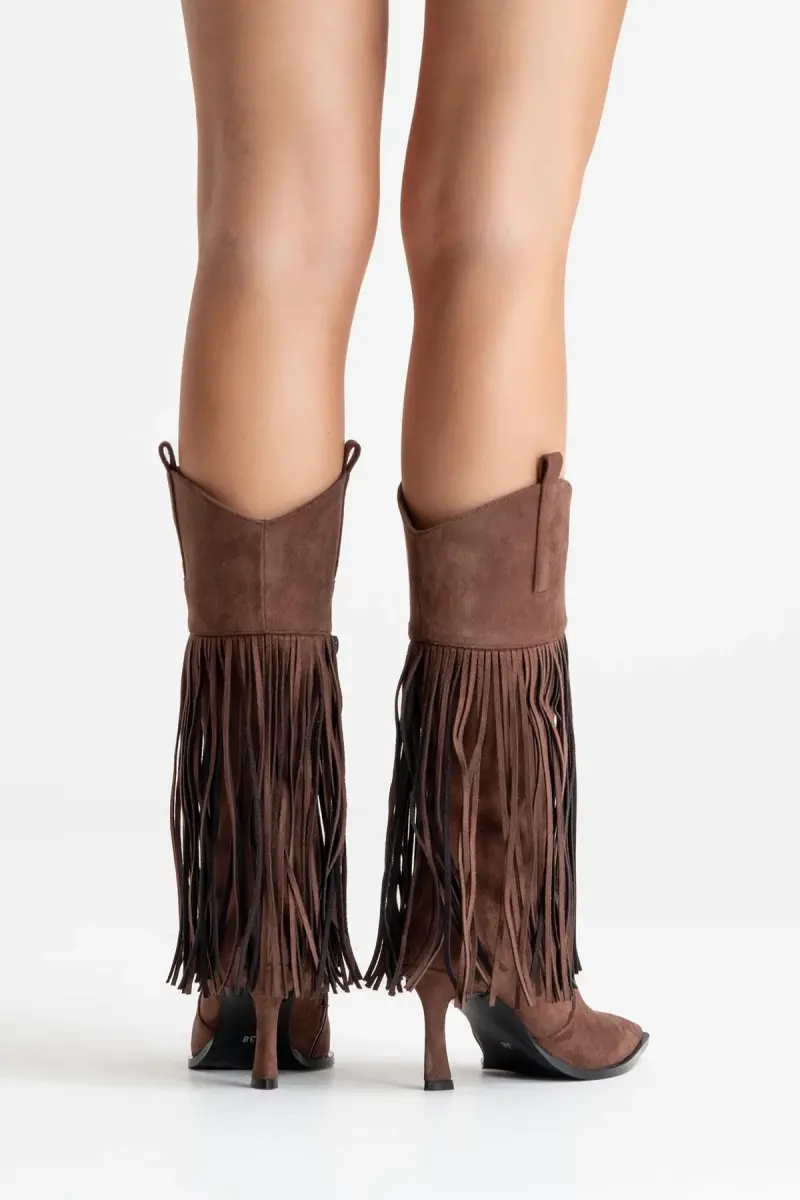 GUERAS Kahverengi Süet Püsküllü Sivri Burun Kadın Topuklu Çizme-Kahverengi Süet