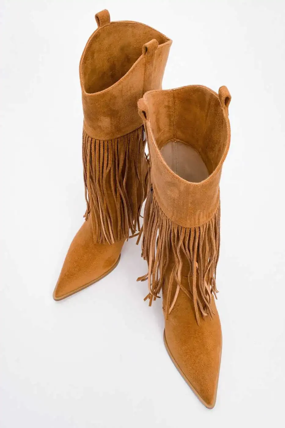 Experience a stylish and comfortable experience with the GUERAS Taba Suede Tassel Pointed Toe Women's Heeled Boots!