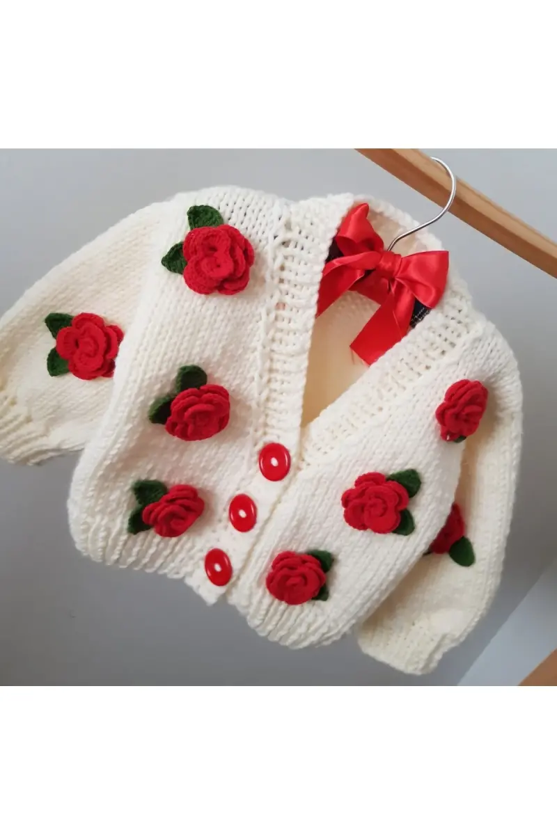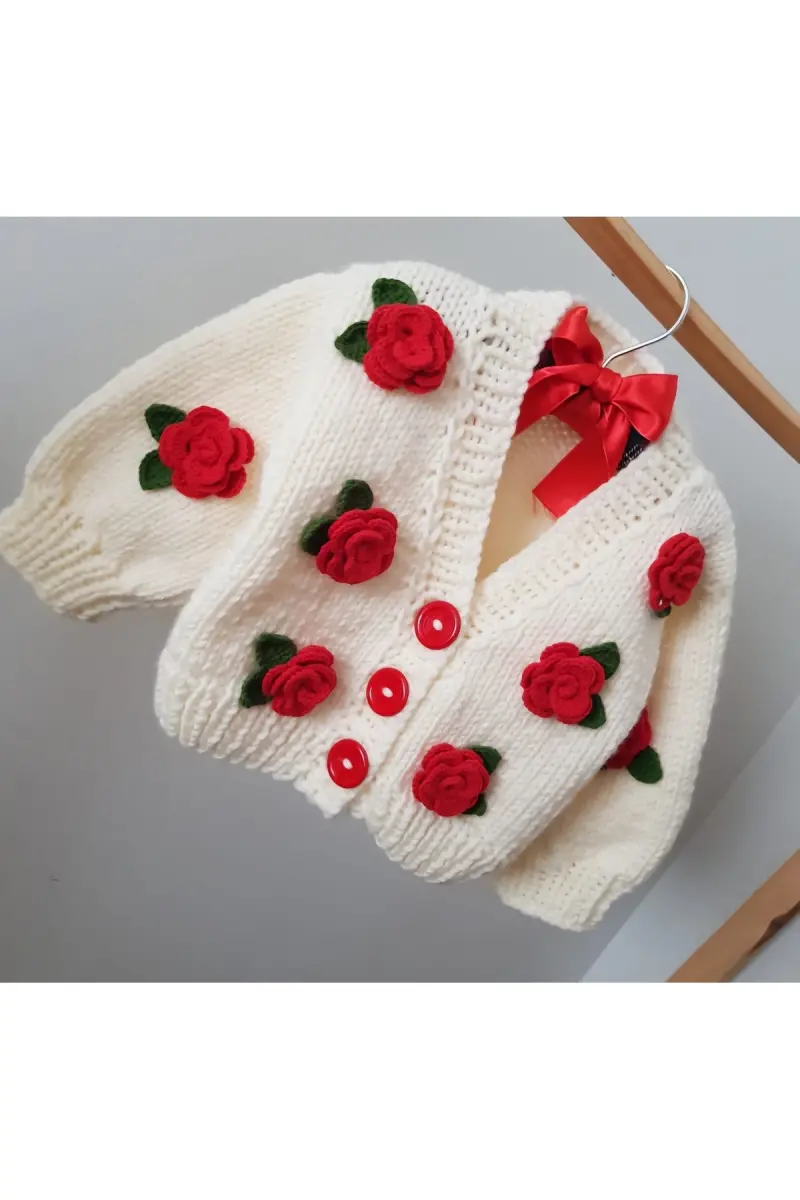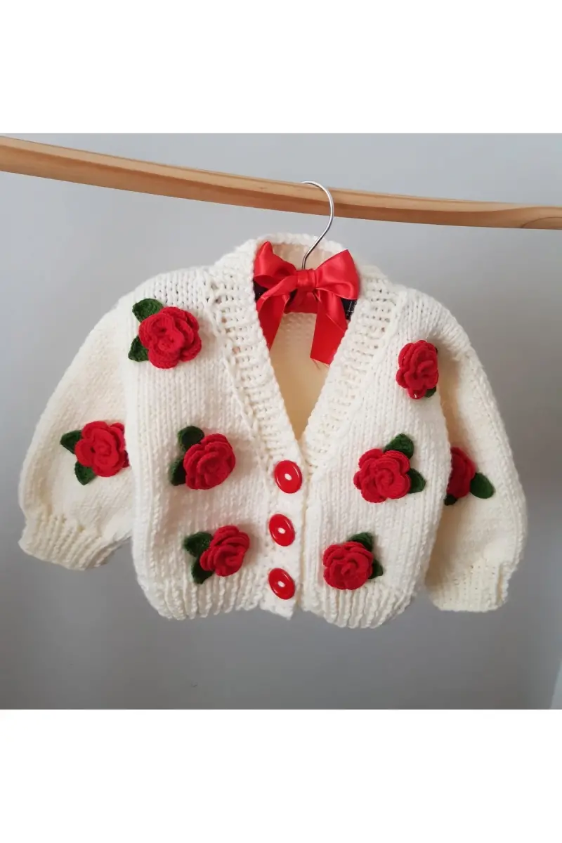 Gül Detaylı El Örgüsü Çocuk Hırka, Çiçek Detaylı Bebek Hırka-BEYAZ