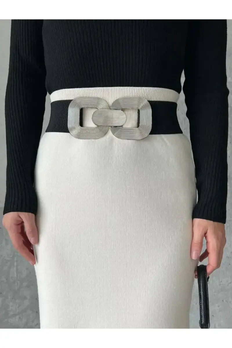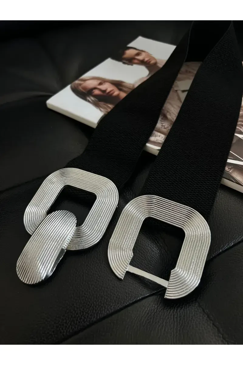 Gümüş Tokalı Siyah Kadın Kemeri | Elastik, Şık ve Çok Yönlü
