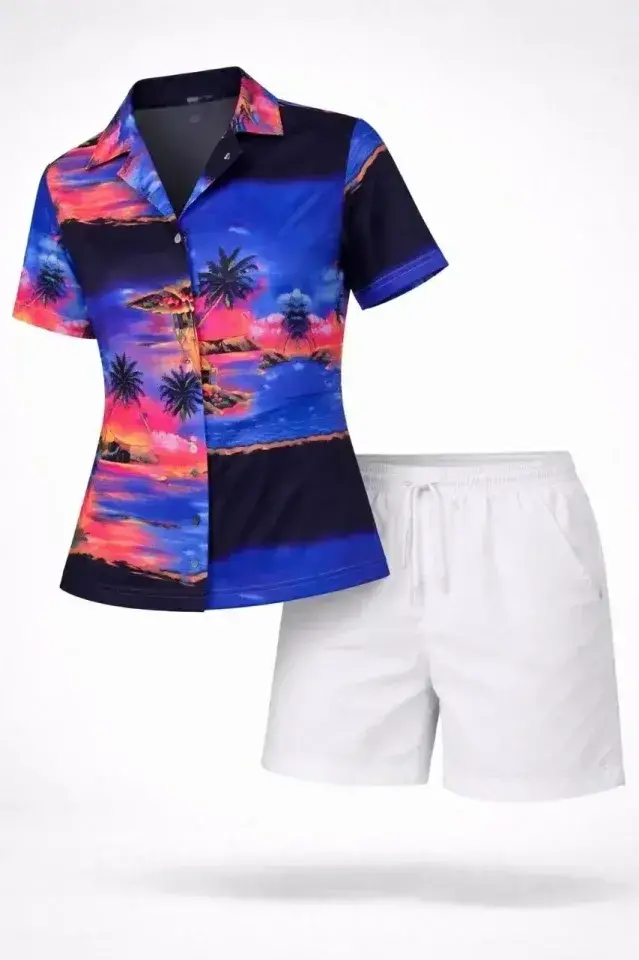 Gün Batımı Tropikal Desenli Kısa Kol Gömlek Şort Takım Yazlık Rahat Kalıp - Desenli