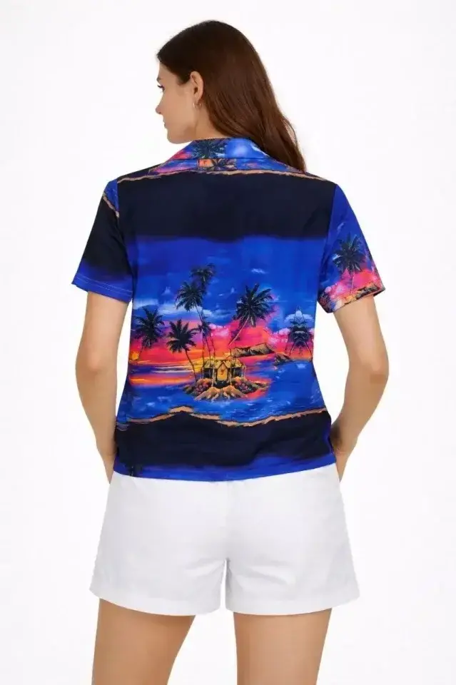 Gün Batımı Tropikal Desenli Kısa Kol Gömlek Şort Takım Yazlık Rahat Kalıp - DesenliModelin Ölçüleri: Boy: 165, Kg: 55, Göğüs: 90, Bel: 72, Kalça: 100Modelin üzerindeki ürün M/38 bedendir