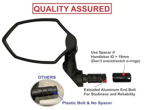 Combine safety and clarity on your bike rides with the Hafny New Bar End Bike Mirror. This premium bike mirror offers an exceptional field of view thanks to its HD automotive-grade glass. You can easily keep track of your surroundings with a similar image quality to what you experience in your car's mirrors. Its shatter-resistant construction enhances your safety against impacts that may occur while riding, allowing you to focus on the road. Whether you mount it on the left or right side, the Hafny New Bar End Bike Mirror can be easily installed on handlebars with inner diameters between 14.8mm and 23mm thanks to its wide compatibility range (open-ended grips or by cutting a hole). Please note: Not compatible with Trek Isozone grips and drop handlebars. Thanks to its 360-degree rotating ball joint, you can effortlessly adjust the mirror to the desired angle. You can ensure stable and reliable use by firmly securing it by hand. The large-sized glass mirror is made of scratch-resistant and HD convex glass. This allows you to have a crystal-clear view while cycling. For added safety, it is covered with a shatter-resistant film, minimizing your risk of injury in the event of an accident. The 5mm Allen key required for easy and quick installation is included in the package. Proudly made in TAIWAN, this bicycle mirror has successfully passed the EU REACH chemical safety test, thus ensuring the safety and reliability of the product. Make your rides safer and more enjoyable with the Hafny New Bar End Bike Mirror.