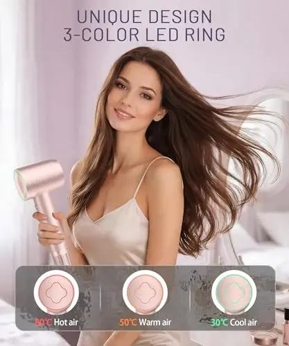 Introducing the Hair Dryer - 150000 RPM High-Speed Brushless Motor Negative Ionic Blow Dryer! This state-of-the-art hair dryer is designed to dry your hair quickly while giving it a healthy and shiny look. This eye-catching pink product will add elegance to your bathroom and will be indispensable both at home and on your travels. Thanks to its 150,000 RPM high-speed brushless motor, it offers 5 times faster drying performance compared to traditional hair dryers. Thanks to the powerful airflow (36m/s wind speed), your hair will dry in just 2-5 minutes, saving you time. The Cosy Companions ionic hair dryer balances static electricity in your hair and prevents frizz by releasing 500 million negative ions during the drying process. At the same time, it preserves the moisture of your hair, making it look softer, fuller and healthier. You get a natural shine and vitality in your hair. This hair dryer is equipped with 8 layers of noise reduction technology. Thanks to air insulation and sound-absorbing material layers, it operates at a sound level of only 51 decibels. This way, you can dry your hair without disturbing yourself or those around you. In addition, it is equipped with a special plug for safe use. The Cosy Companions hair dryer prevents your hair from being damaged thanks to its smart temperature control. The high-performance chip control system measures the air temperature more than 100 times per second and adjusts the heat accordingly. In this way, overheating of your hair is prevented and it remains healthy. You can easily follow the temperature setting thanks to three different LED lights: red for hot air, yellow for warm air and green for cold air. Thanks to its ergonomic design and lightness (0.82 lbs/373g), this hair dryer offers comfortable use. It is a product that everyone can easily use with its simple buttons and convenient handle. Thanks to its tight filter, your hair is prevented from being pulled in. Thanks to its 360° rotating magnetic head, it offers the possibility of use suitable for different hair lengths and types. Whether at home or on the go, this hair dryer will always be with you. It is also a perfect gift option for your family and friends. Please read the user manual carefully before use. Warning: Do not place the product where it may fall or be pulled into water, and do not drop it into water or other liquids.