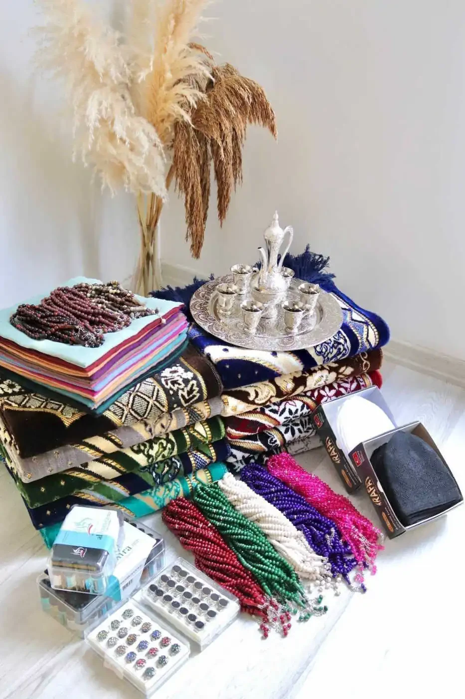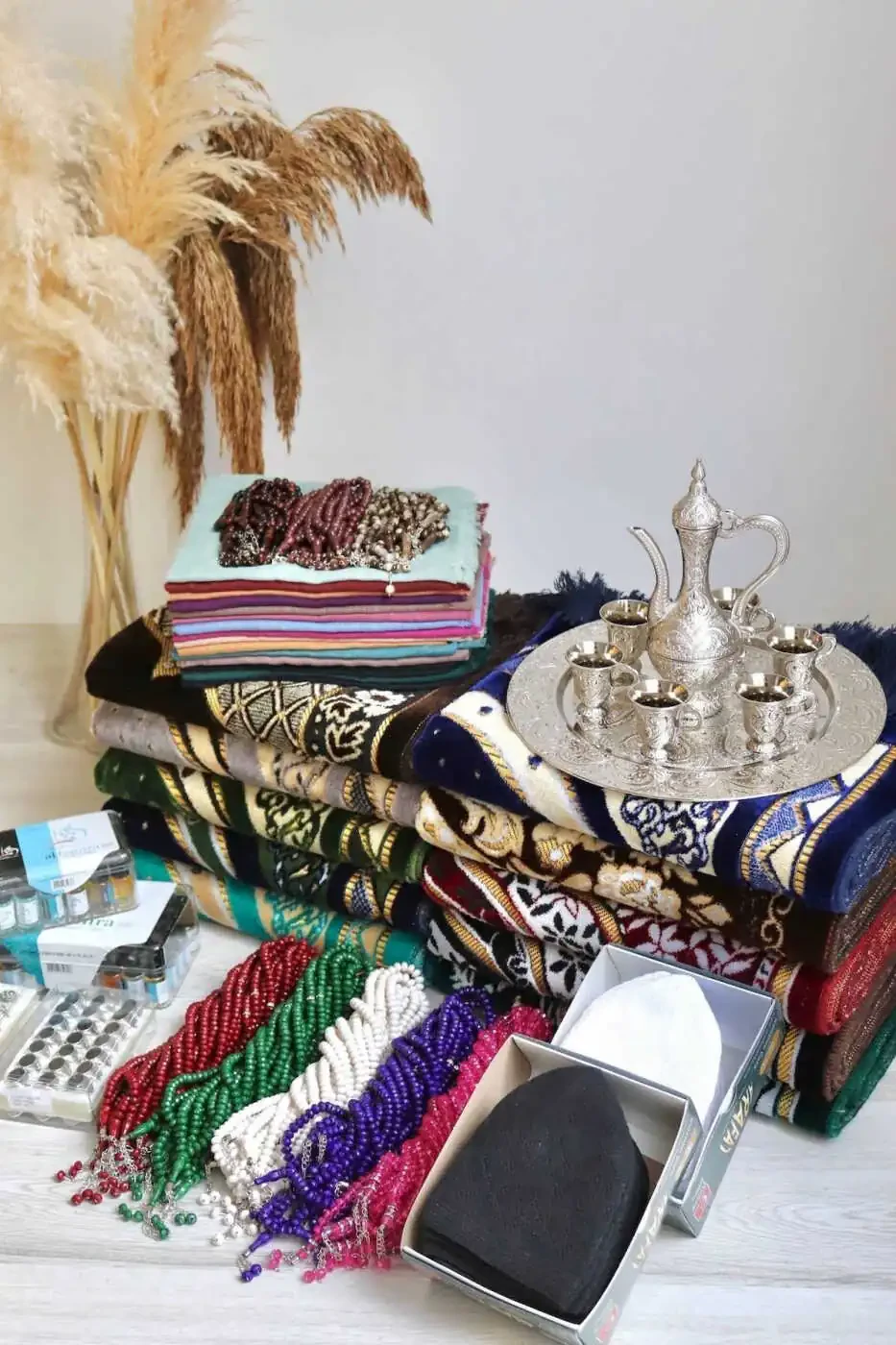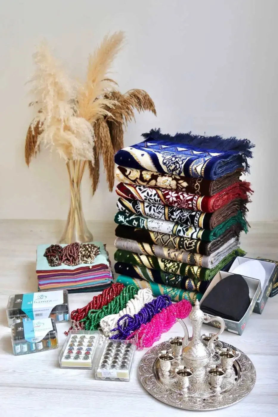 This Hajj and Umrah Souvenir Set is specially designed to offer your loved ones a meaningful memento of your pilgrimage. The 20-person set is composed of high-quality products and has been carefully selected. Each product is made from quality materials and has been uniquely combined into a special set that can be a special gift for your loved ones or yourself.Contents of the Set:* 20 pieces of colorful luxury velvet prayer rugs* 20 pieces of 99-crystal rosaries* 20 pieces of 33-mono rosaries* 24 pieces of prayer caps* 20 pieces of cotton square covers* 24 pieces of 5 cc. essences* 36 pieces of antimony rings* 42 pieces of stone-patterned men's rings* 1 piece of Ebruli-Payitaht Zemzem setFeatures:* 20-Person Hajj and Umrah Gift Set* Carefully Selected Products* High-Quality Materials* Meaningful and Unforgettable Gift* Long-Lasting and Durable ProductsIndulge your loved ones or yourself with this special Hajj and Umrah Gift Set. It offers a special way to immortalize your meaningful memories and strengthen your spiritual bond.