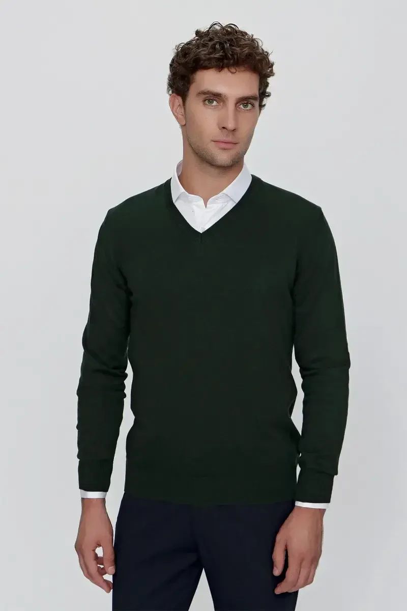 Haki kazak, triko kazak, V yaka kazak, rahat kesim kazak, dinamik fit kazak, basic kazak, erkek kazak, sonbahar kazak, kış kazak, şık kazak