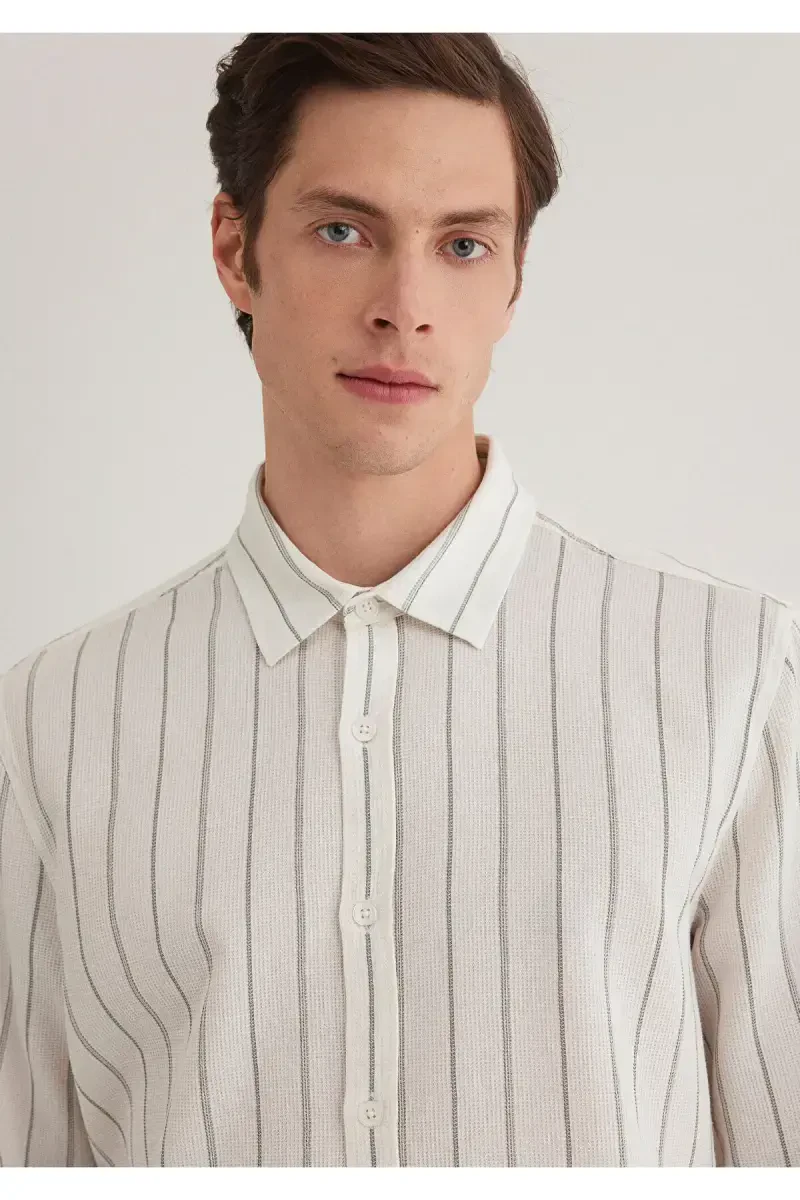 Haki Çizgili Ekru Gömlek Regular Fit / Normal Kesim 0211384-80692-Yeşil