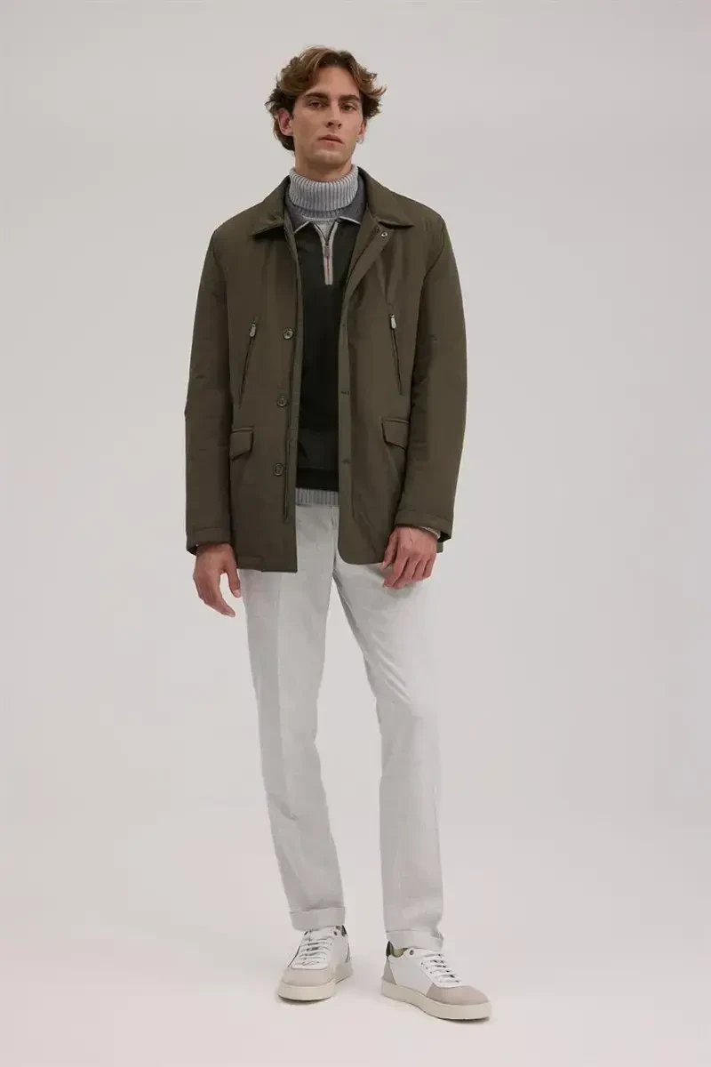 Haki mont, comfort fit mont, erkek mont, bebe yaka mont, fermuarlı mont, şık mont, rahat mont, kışlık mont, haki erkek mont, mevsimlik mont
