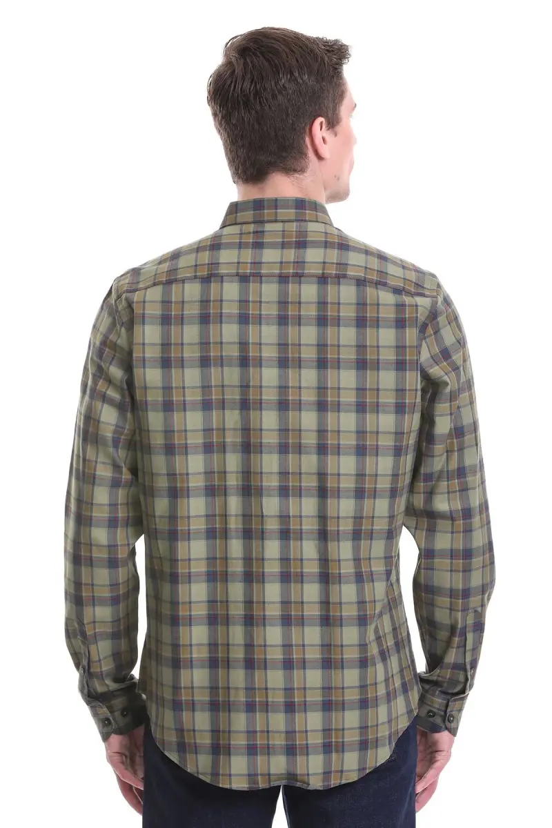 Haki Comfort Fit Kareli 100% Pamuklu Düğmeli Yaka Uzun Kollu Klasik Gömlek-Haki