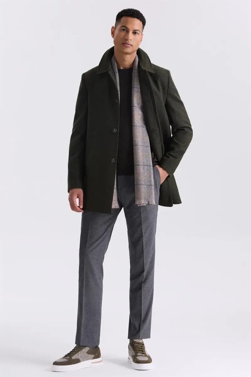 Haki kaşe kaban, Klasik fit, Berberi yaka, Yünlü kumaş, Soğuktan koruma, Şıklık