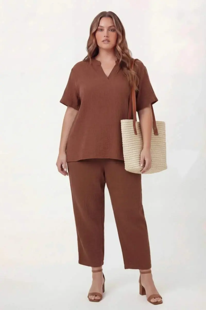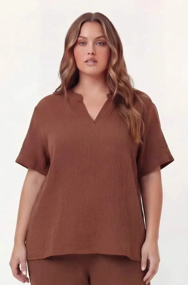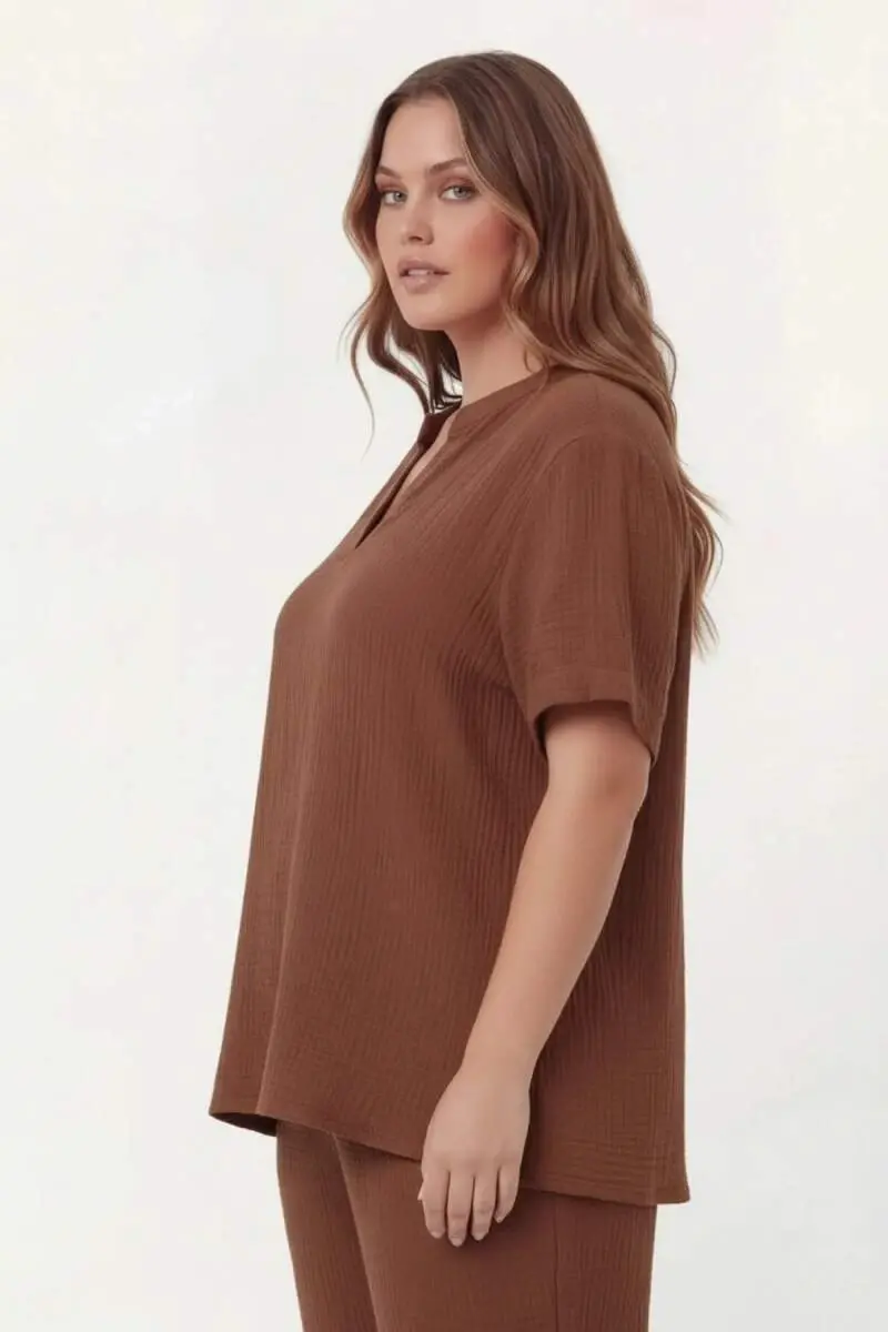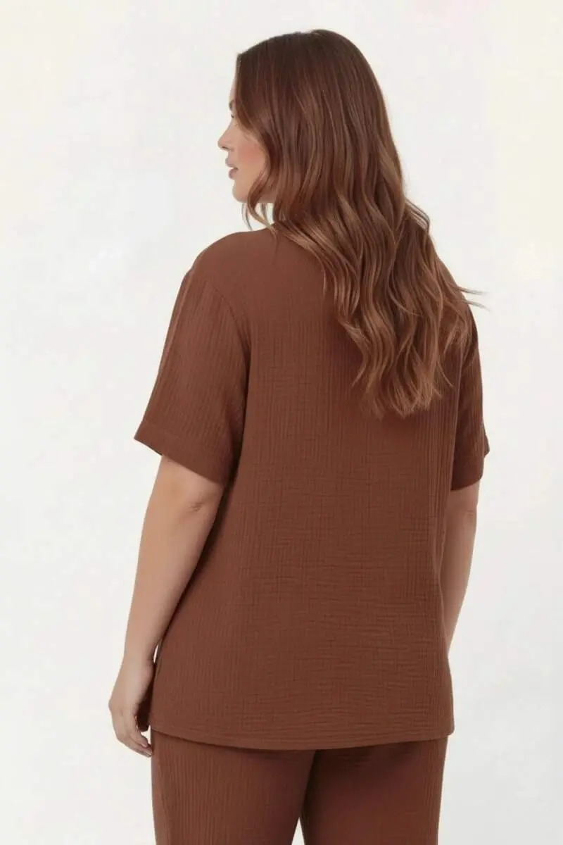 Hakim Yaka Büyük Beden Müslin Kumaş Bluz Kahve