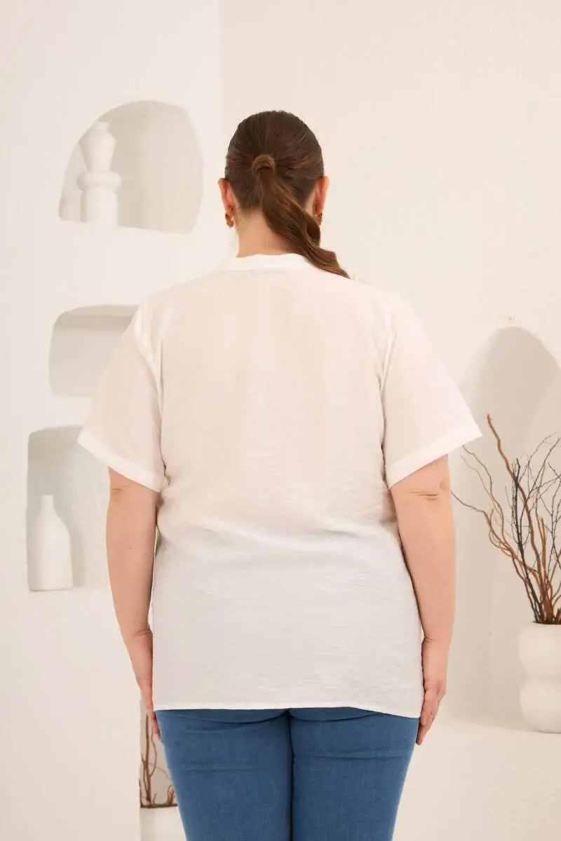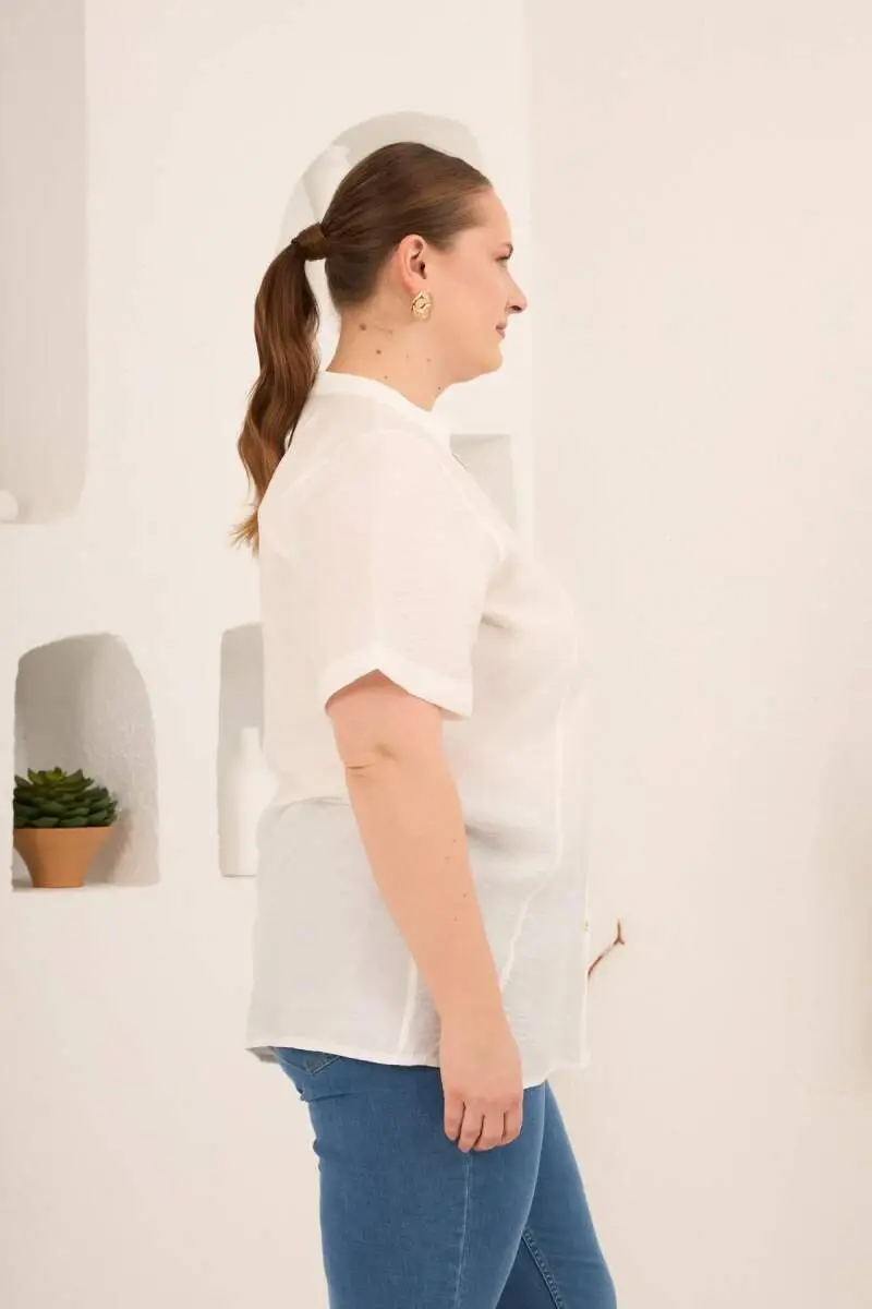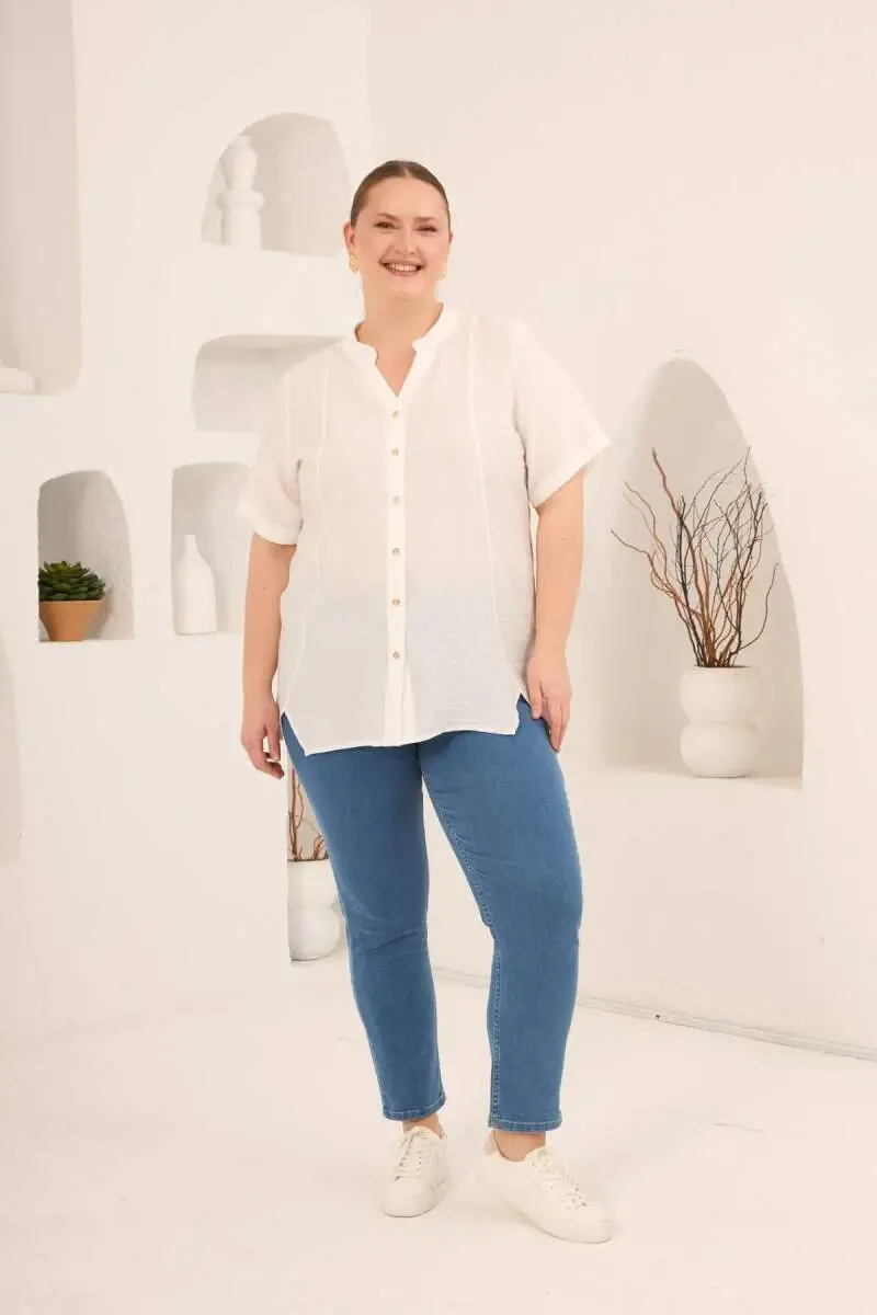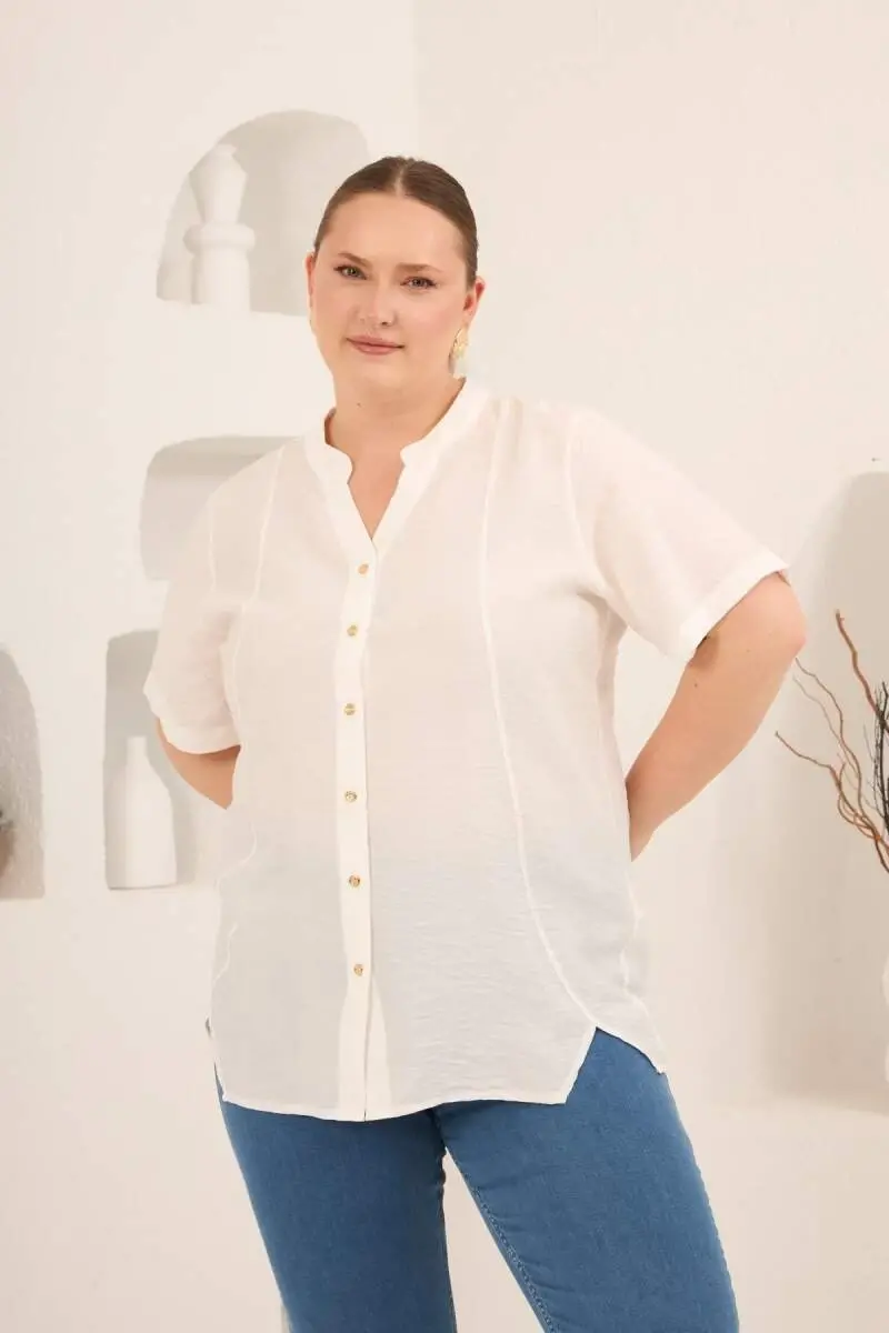 Hakim Yaka Ön Yırtmaçlı Kadın Büyük Beden Gömlek Ekru
