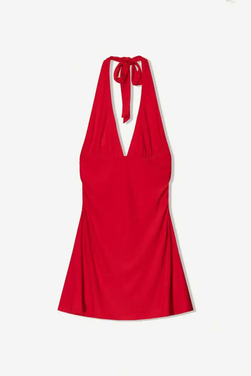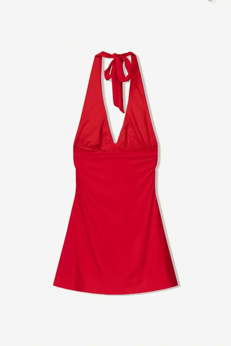 Combining elegance and comfort, the Halter Neck Mini Dress will be an indispensable part of your summer days! With its elegant halter neck design, it beautifully emphasizes your shoulders and neck, while its mini length highlights your legs. Made from a blend of 96% polyester and 4% elastane, the fabric has both a soft texture and a flexible structure that hugs your body. Thanks to this feature, it allows you to move comfortably throughout the day and provides a perfect fit. With its modern and minimalist design, it can be easily combined with all kinds of shoes and accessories. In daily life, at friends' gatherings, or at special invitations, the Halter Neck Mini Dress is with you whenever you want to feel comfortable without sacrificing your elegance! Its white color represents purity and freshness, while at the same time offering the freedom to combine it with any color as it is compatible with every color. Thanks to the lightness and breathability of its fabric, you can enjoy a comfortable wearing experience even in hot weather. With this dress, you will feel free, stylish, and feminine. The product is also very easy to care for. It can be machine washed at 30 degrees on a delicate wash program and ironed at low heat. Thanks to its high-quality fabric and careful stitching, it is a candidate to be one of your favorite pieces in your wardrobe for a long time. Don't miss this dress, which we have more than 10 pieces in stock! Order now and enjoy the summer with elegance and comfort.