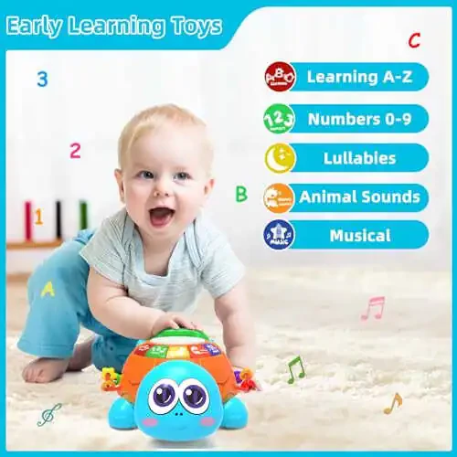 【Multi-Functional Turtle Learning Toys】Our turtle toy can help babies learn numbers and letters, it has nice lights, fun music, and practice cute finger skills with different buttons. It encourages baby to crawl and walk, which helps babies' motor skills, visual development, and coordination. 【Light-up Musical Turtle Toys】Tired of taking your baby to bed? You need it. Our toy has a nice lullaby, soft eye protection light with adjustable volume and auto shut off that can help baby fall asleep. We have a useful 2-stage volume function for parents and to protect the baby's hearing. 【Baby Girl Crawling toys】Press the turtle button and it will move, nod, and play music under the LED light at the same time! It will attract your baby to crawl around the turtle toy. Can also improve your baby's awareness of colors, shapes, A-Z, 0-9 and animals, a popular learning toy for babies, help 6-18 months toddlers learning toys. 【Baby Pretend Phone Call Toy】Our baby crawling toy with special phone games, realistic dialling sound, 7 bells and greetings "hello" and "goodbye", so that the baby into the phone scene, improve the baby's desire to communicate, exercise muscle memory, take home and baby to enjoy happy parent-child time! 【Safe & Perfect Baby Girl Gift】Our baby toy are made of high quality ABS material and rubber, BPA free, rounded edges, safe for baby, soft light, protect baby's eyesight and hearing. Beautiful baby girl & boy gift design for babies 1-2 years old as a birthday gift, easter gift & shower gift & christmas gift, perfect for early education for 3 5 6 7 8 9 10 11 12 18 months. Requires 3 AA batteries (not included).