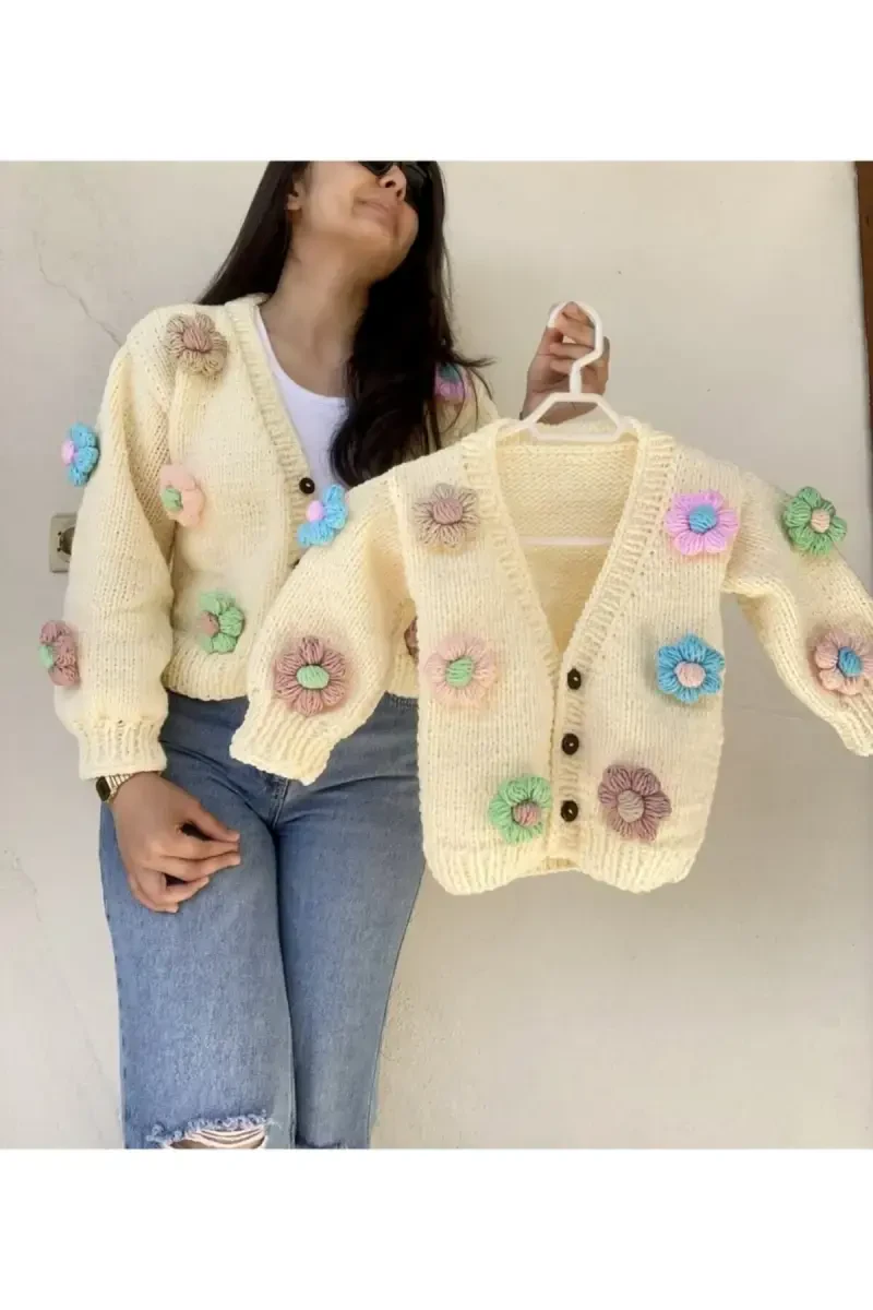Bring together elegance and grace for both you and your little princess with the Hand-Knitted Mother-Daughter Combination Daisy Flowered Cardigan - Cream Color. This special design cardigan, carefully prepared by Hobihanem Tuhafiye, will be indispensable for mother-daughter combinations. The warmth of the cream color and the naivety of the daisy flowers offer a striking look in any environment. This cardigan is not just a piece of clothing, but also an expression of love. It symbolizes togetherness, a warm bond where you will accumulate special memories. The fact that it is hand-knitted and contains effort and care in each stitch distinguishes this cardigan from others. It is produced using natural and high-quality materials that do not harm your baby's sensitive skin. The straight-cut design allows your baby to move comfortably while maintaining its stylish appearance. It is produced in standard size and fit and can be easily put on and taken off. The vibrant colors of the daisy flowers add joy to the cardigan and reflect your baby's energy. 100% hand-knitted woven fabric guarantees its durability and long-lasting use. Thanks to the knitting technique, it keeps you warm and provides a soft touch. It keeps your baby warm in cold weather and offers all-day comfort thanks to its non-sweating structure. The Hand-Knitted Mother-Daughter Combination Daisy Flowered Cardigan - Cream Color is a meaningful option that you can give as a gift to your loved ones on special occasions, birthdays or just because. With this cardigan, both you and your baby will always feel stylish and safe. Remember, this is not just a cardigan, but also a symbol of love, care and togetherness.
