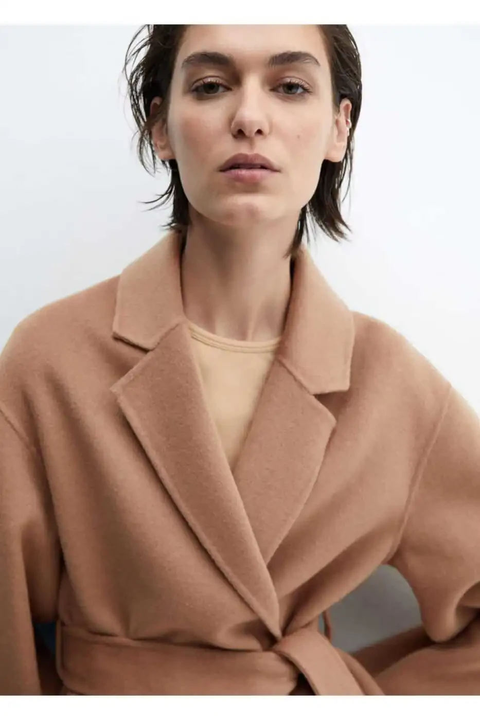 **Belted Handmade Coat**Delivered with the assurance of Trendyol, this stylish coat is ready to become an indispensable part of your wardrobe.**Features:*** Made from recycled wool blend fabric.* Its oversized model and Medium design offer comfortable use.* It has a classic look with its V-neck, long sleeves, and two front pockets.* Its removable belt provides versatile use.* The slit detail at the bottom offers freedom of movement.* It has a stylish design suitable for office wear.**Material:*** Coat: 55% wool, 40% polyester, 2% acrylic, 2% polyamide, 1% viscose* Belt: 55% wool, 40% polyester, 2% acrylic, 2% polyamide, 1% viscose* Lining pocket: 52% polyester, 48% viscose**Measurements:*** Side seam length: 88.5 cm* Back length: 116 cm**Care Instructions:*** Do not wash* Do not bleach* Iron at maximum 110°C* Apply perchloroethylene mechanically limited dry cleaning* Do not tumble dry