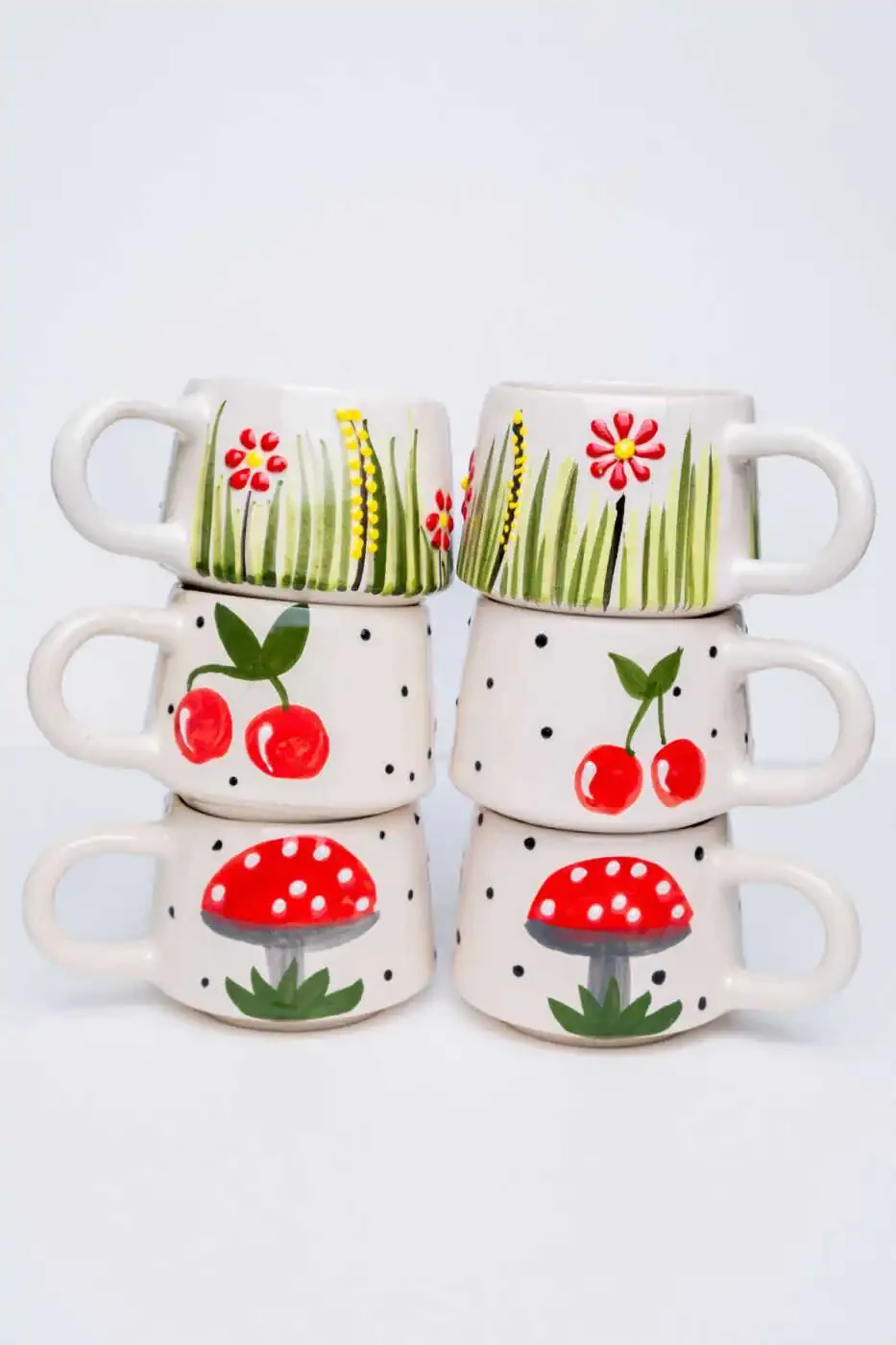 Handmade Ceramic 6-Piece Coffee Mug Set - Double Cups Decorated with Red Themes