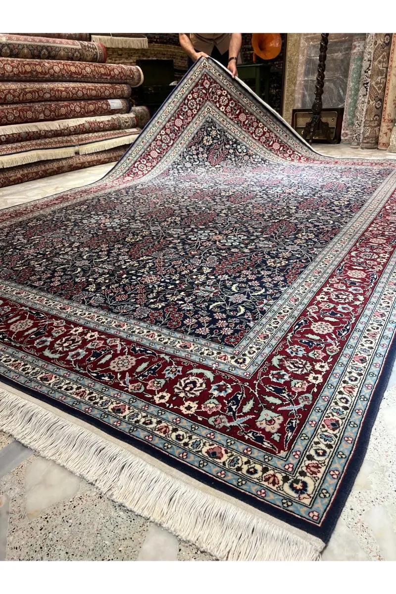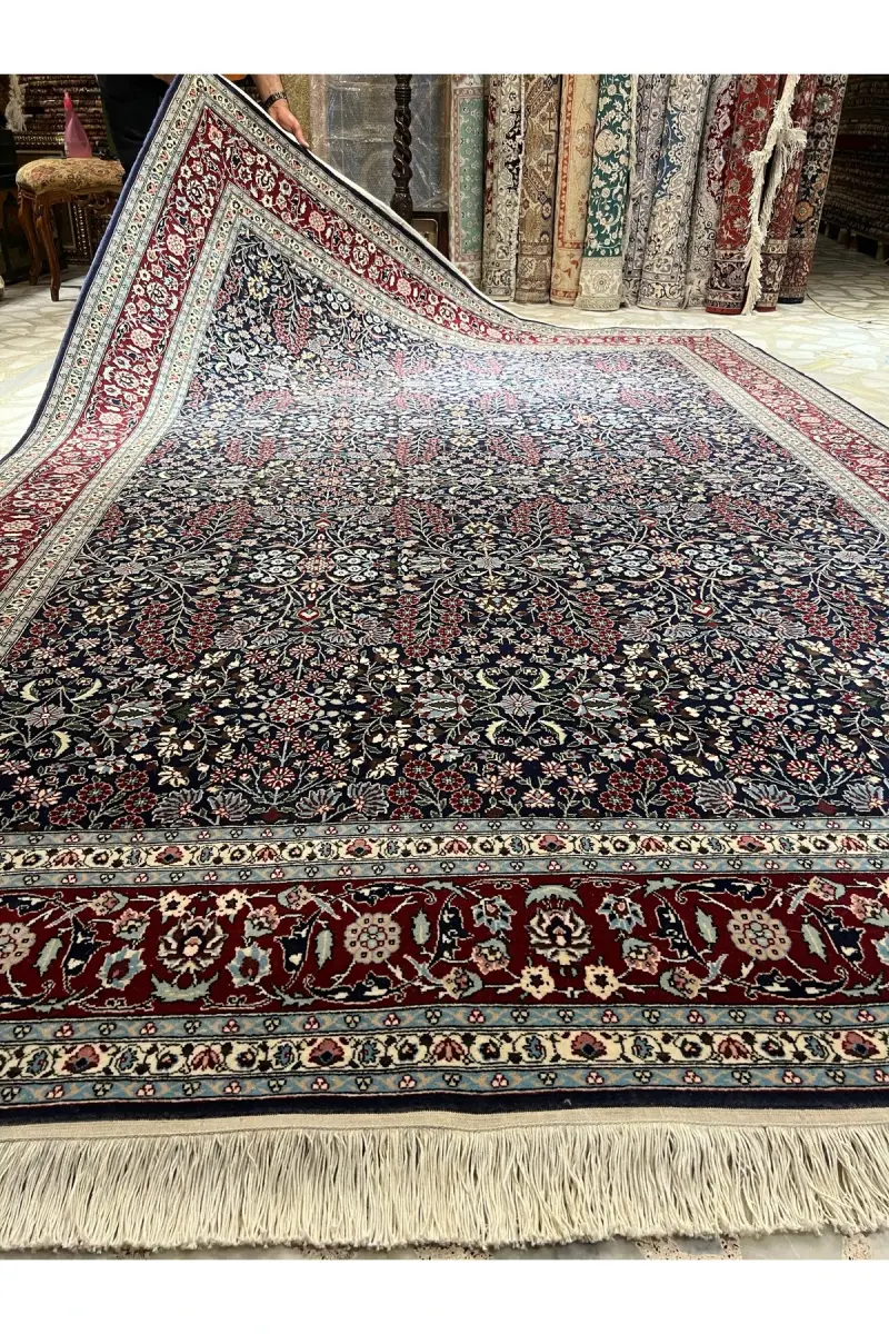 The Handmade Hereke Carpet Seven Mountain Flowers Model is a unique piece carefully designed and produced by RD RAMAZAN DAĞ EL HALI SANATI, which will add unparalleled elegance to your spaces. This carpet combines the intricacies of traditional hand weaving with modern design, offering an artistic touch to every corner of your home. The Seven Mountain Flowers model attracts attention with its unique design that reflects the vitality and colors of nature. The navy blue background of the carpet highlights the floral motifs on it, creating a calm and peaceful atmosphere in the environment. This rectangular carpet, measuring 310x218 cm, is an ideal option for your large living spaces, living rooms or bedrooms. Being hand-woven ensures that each carpet is unique and distinctive. This carpet, meticulously woven by master hands, maintains its beauty for many years thanks to its high-quality silk and wool blend material. The silk and wool blend adds both durability and softness to the carpet. The medium pile height (6 - 12 mm) provides a comfortable feel to your feet when walking on the carpet. At the same time, it ensures that the carpet is easy to clean and maintain. The woven base structure prevents the carpet from slipping on the floor and offers safe use. The flat fringe type completes the simple and elegant appearance of the carpet. The Handmade Hereke Carpet Seven Mountain Flowers Model is not just a carpet, but also a work of art. Create an unforgettable atmosphere in your spaces with this special carpet that adds value to your home, impresses your guests and brings a personal touch to your living spaces. This carpet, which is also suitable for heavily used areas such as entrance halls, offers both elegance and functionality. Its rectangular shape, which easily adapts to your space, adds a modern and aesthetic touch to your decoration. This carpet will be one of the most valuable pieces of your home and will be a legacy to be passed down from generation to generation. Remember, this unique carpet is carefully produced by RD RAMAZAN DAĞ EL HALI SANATI and is waiting for you to add elegance to your home.