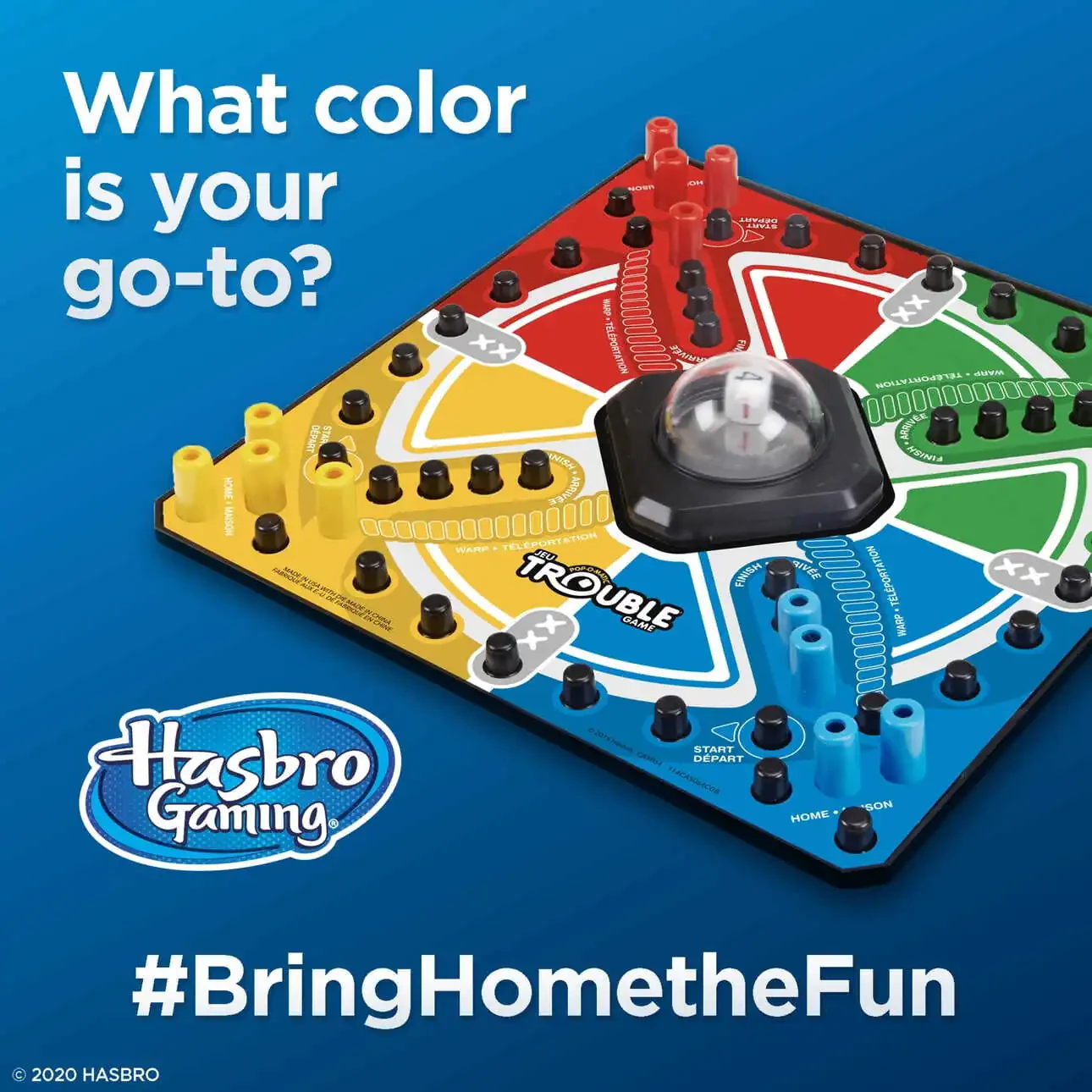 Hasbro Trouble Board Game bilan hayajonli sarguzashtga tayyor bo'ling! Ushbu klassik o'yin 5 yosh va undan katta bolalar va oilalar uchun mo'ljallangan, 2 dan 4 gacha o'yinchi bilan o'ynaladigan, qiziqarli stol o'yinidir. Trouble musobaqa, ta'qib va piyodalarni portlatish hayajonini birlashtiradi. O'yinning sehrli kuchi o'yinchilar zarni tashlash uchun Pop-O-Matic pufakchalarini bosgan paytdan boshlanadi. Keyin o'yinchilar 4 ta o'yin piyodasini taxta atrofida aylantirish uchun poyga qiladilar. Ammo ehtiyot bo'ling! Agar bir o'yinchi piyodasi boshqa o'yinchi bilan bir xil kvadratga tushsa, orqaga qaytarilishi mumkin. Barcha 4 piyodasini ham finish hududiga birinchi bo'lib yetkazgan o'yinchi g'alaba qozonadi.