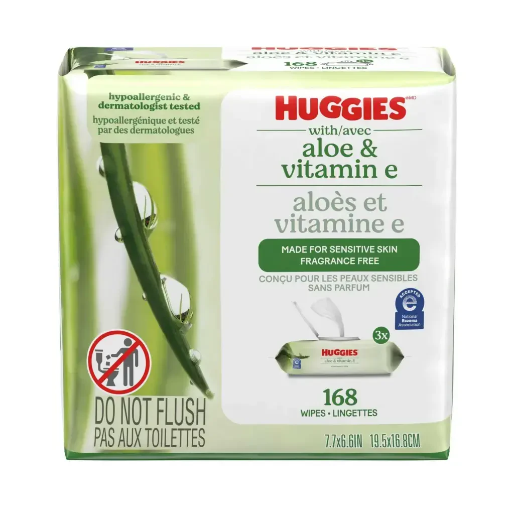 **Влажные салфетки Huggies Aloe & Vitamin E для чувствительной кожи, без запаха, 3 упаковки с откидной крышкой (всего 168 шт.)**
